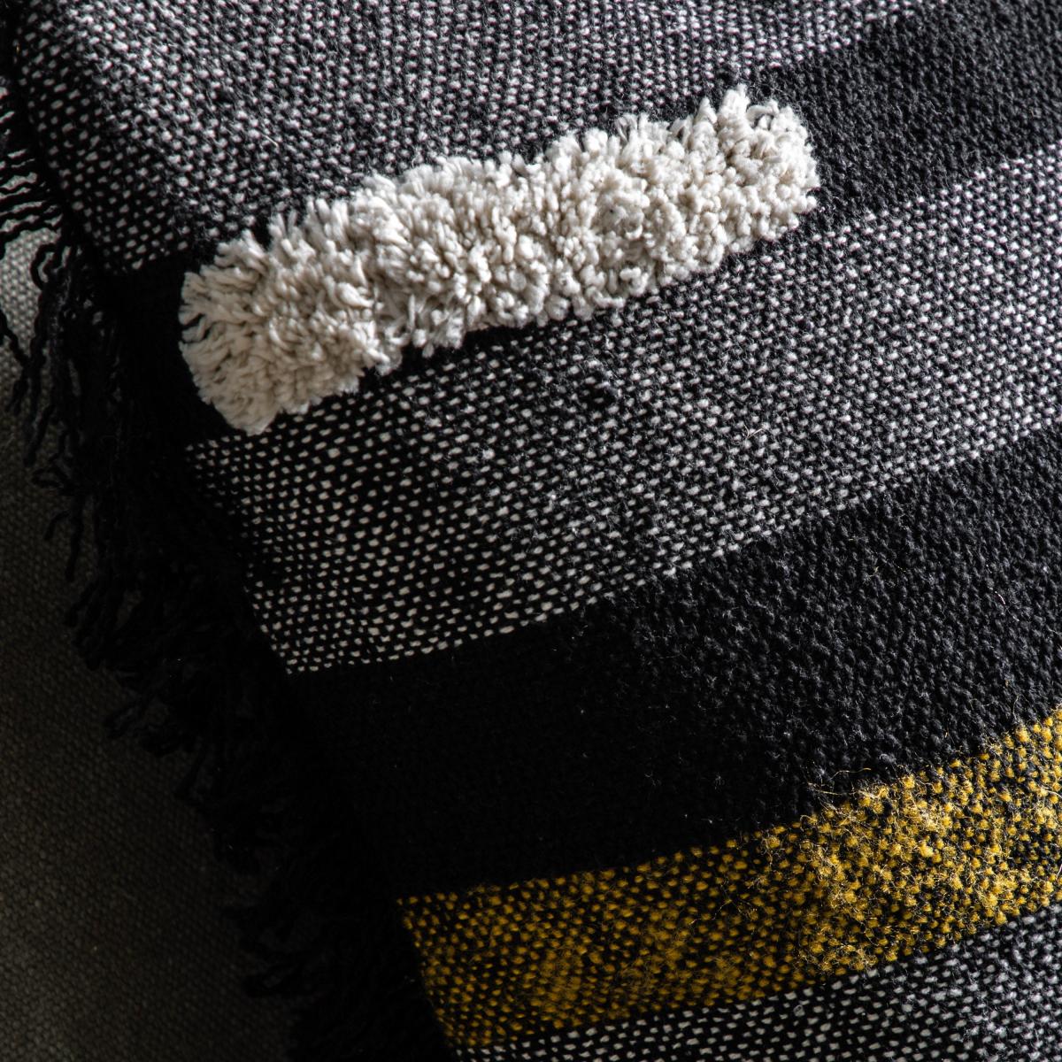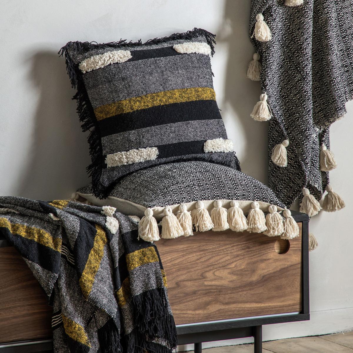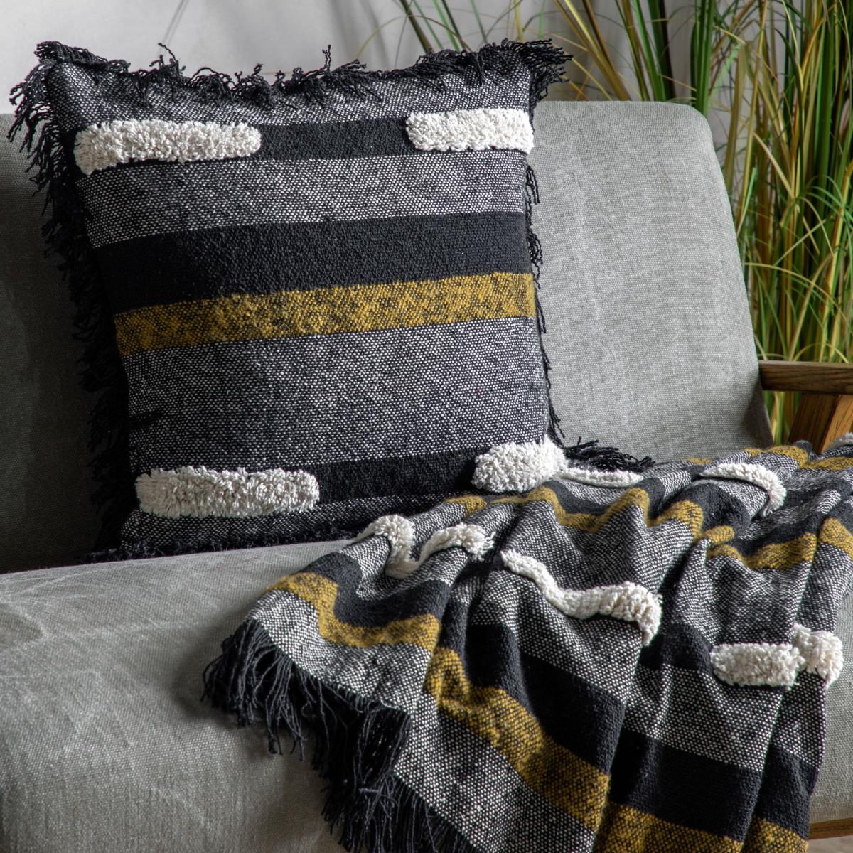 I love this one for adding texture and visual interest to a sofa or armchair. Its tufted design with contrasting stripes pairs well in both contemporary and eclectic interiors, making it versatile across various styles. It works particularly well in neutral or muted colour palettes, providing a pop of pattern without overwhelming the space. Practical styling tips include mixing it with smooth-textured cushions to balance the tactile feel or layering it against plain cushions for a layered, cosy look. It’s also a great choice for making a seating area feel more inviting and comfy in living rooms or even bedrooms.