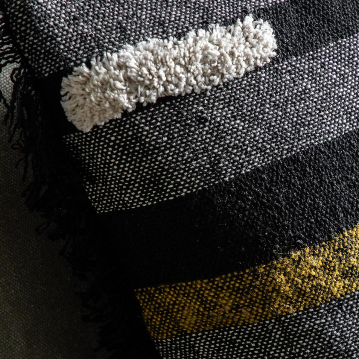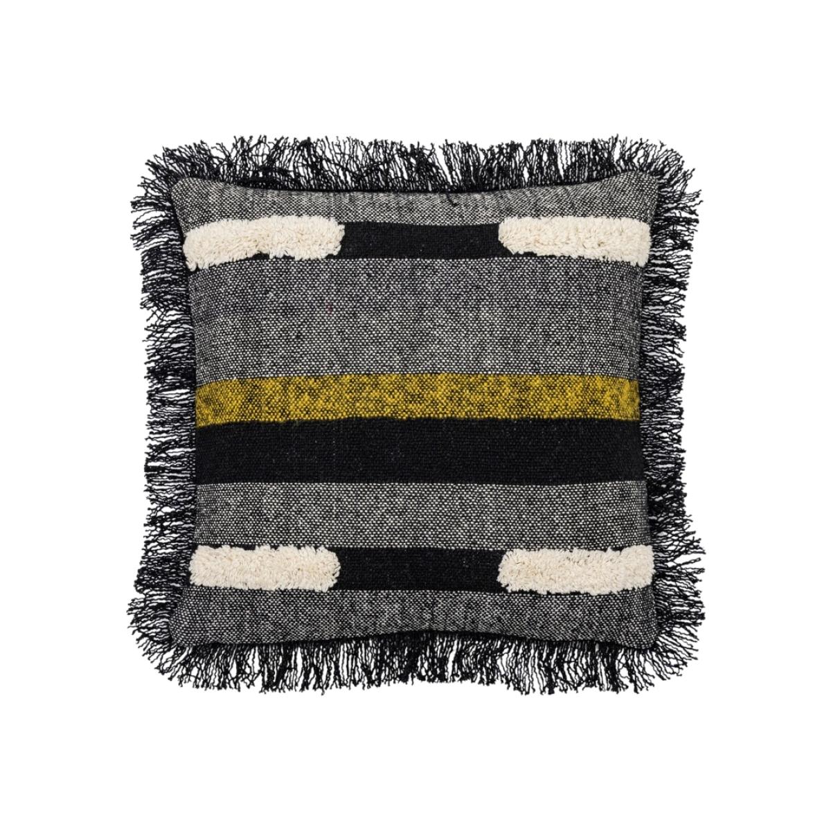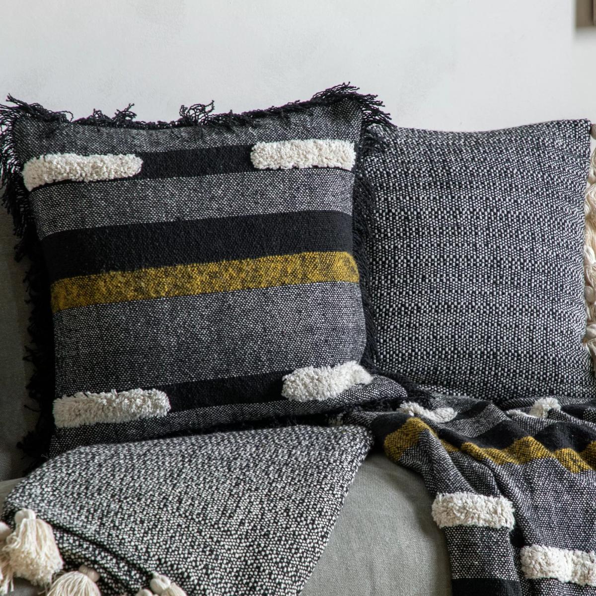 Tufted Blocks Filled Cushion with Fringe - Black/Grey