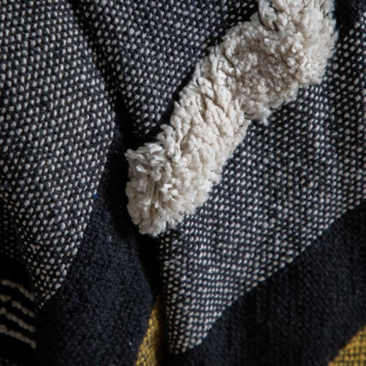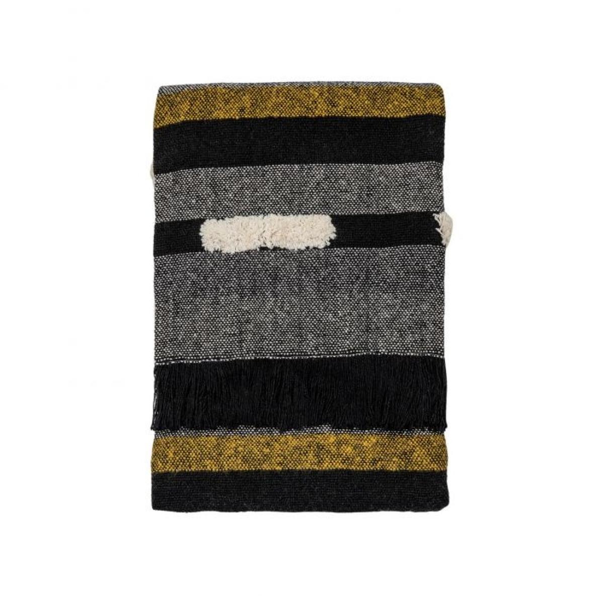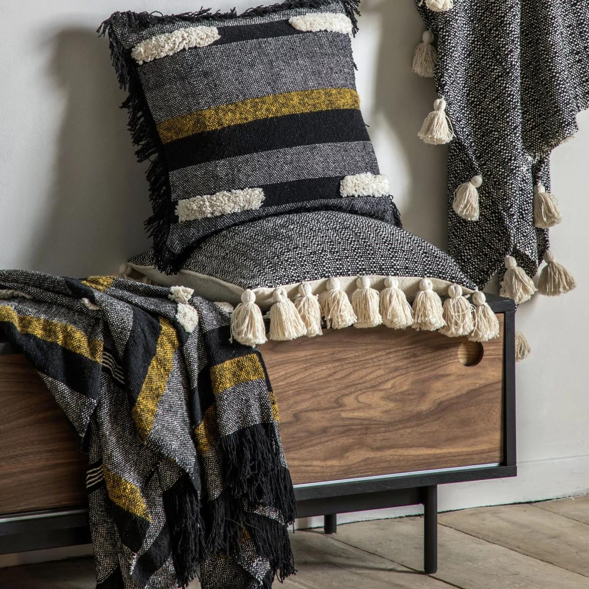 A stylish and contemporary throw, featuring blocks of different colour and fabrics and a delicate fringe around the edge. Colour - Black / Grey Material - Cotton / Polyester Fabric Weight - 990gsm Size - 1.3m x 1.7m All screens vary in colour reproduction and whilst every effort has been made to display the colour as accurately as possible it is for guidance only.