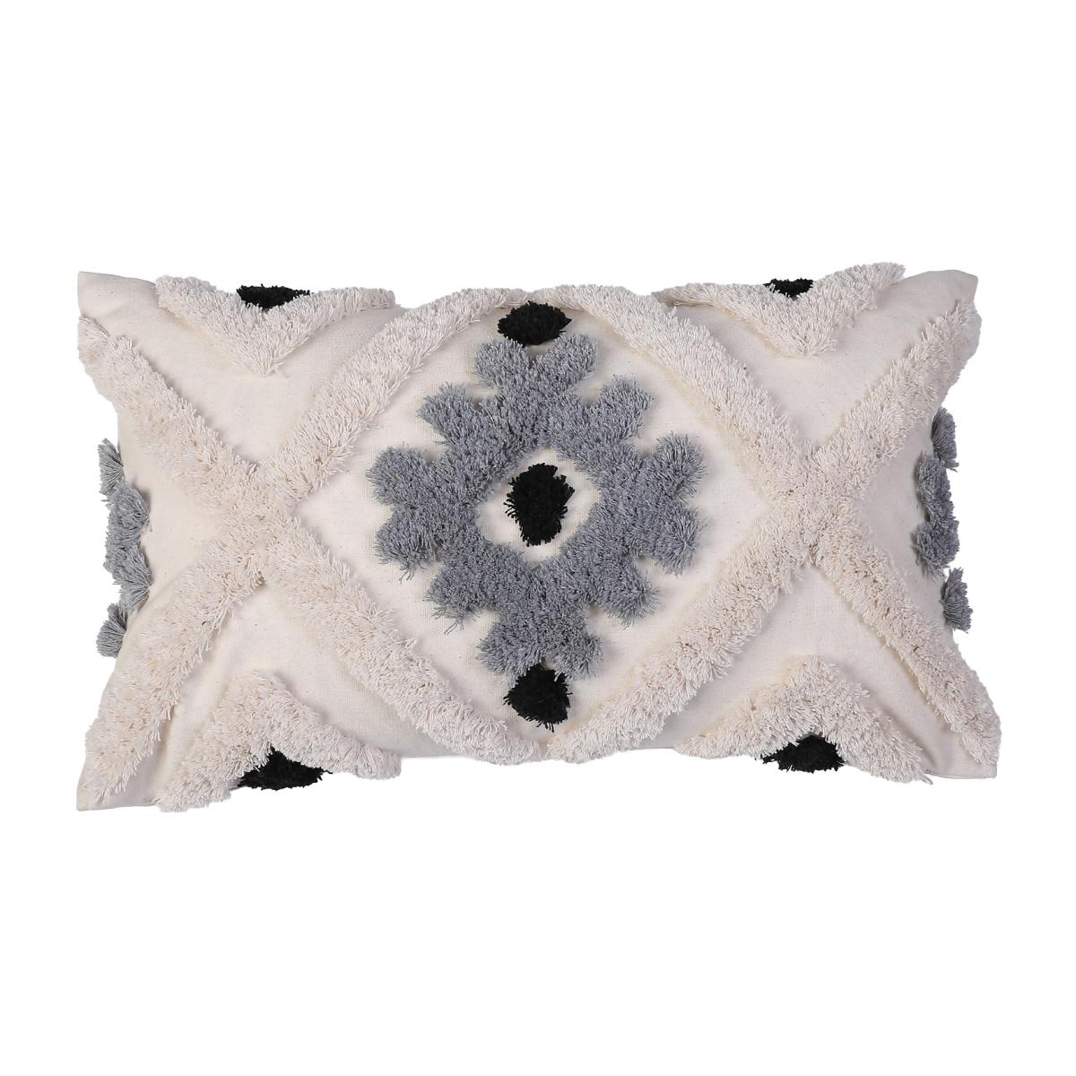 Add some Boho-chic to your sofa with this Aztec inspired tufted geomentric motif cushion. In mixed tones of natural, black with an accent of grey. Plain cotton canvas reverse.