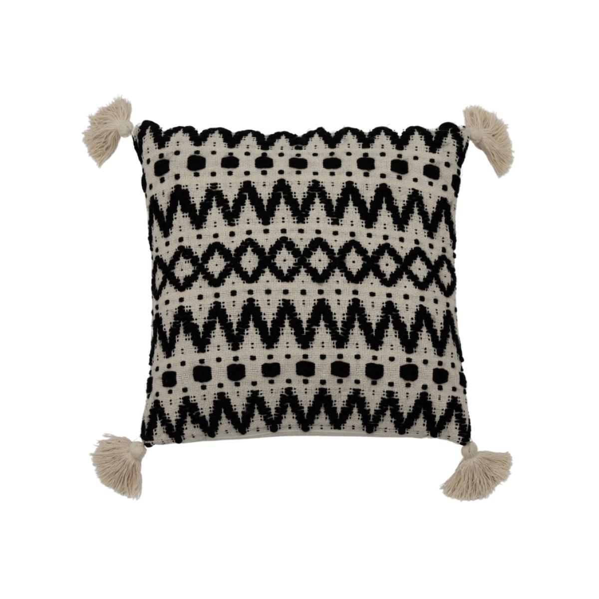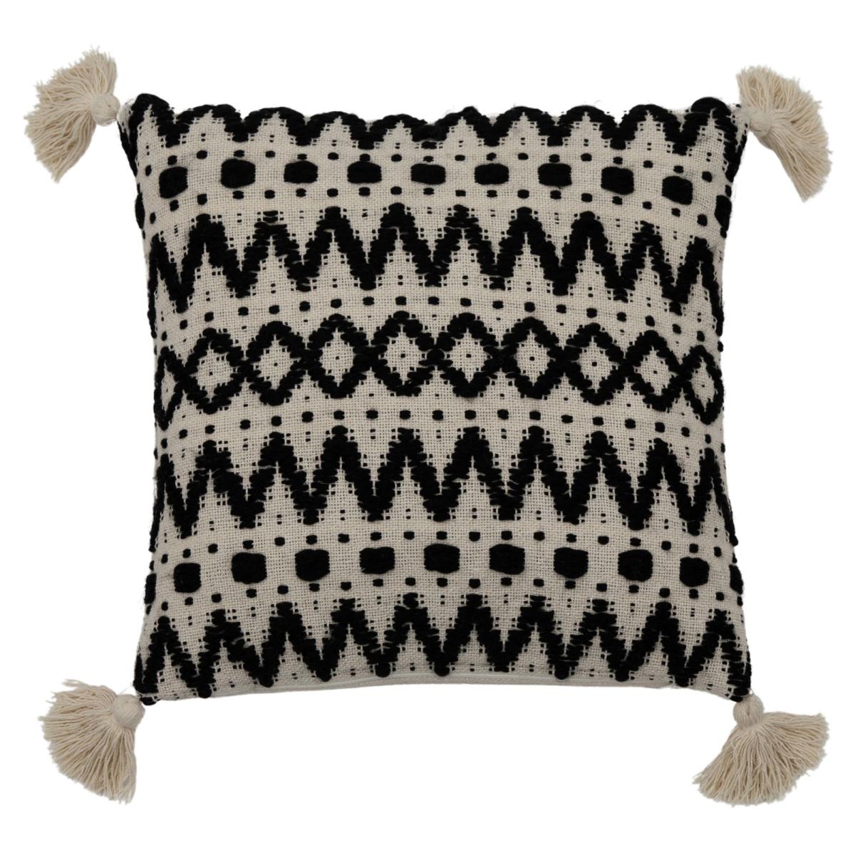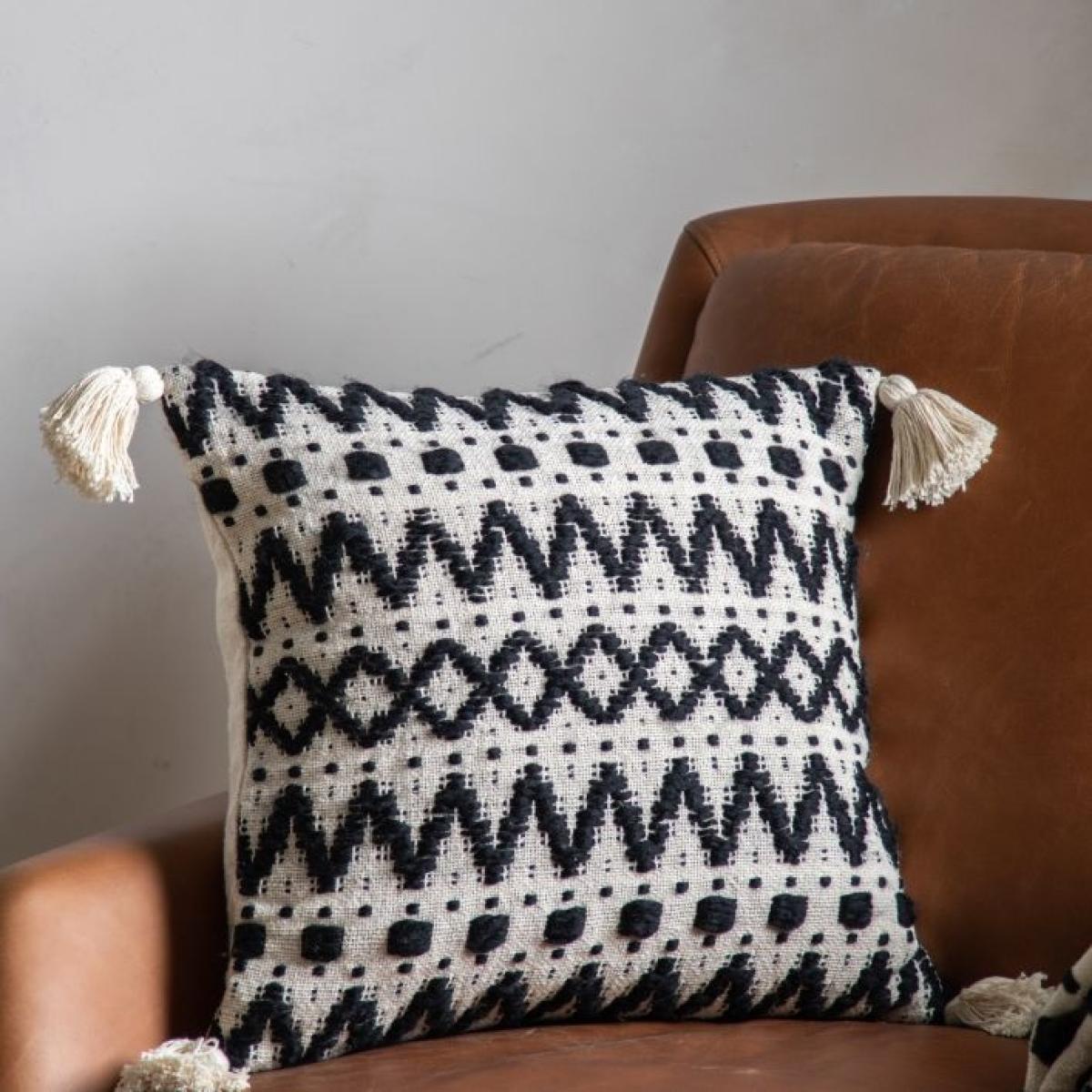 I love this cushion because of its versatile black and cream palette, making it easy to incorporate into a variety of interiors. It works especially well in modern, Scandinavian, or eclectic spaces, bringing a touch of texture and pattern without overpowering the room. The square shape and tufted design add a subtle sense of sophistication, while the decorative tassels give it a playful edge. For styling tips, try pairing it with neutral-toned sofas or armchairs to boost visual interest, and consider layering with other cushions in complementary textures or colours for a curated, layered look. It’s practical too, offering both comfort and style, making it a great finishing touch in living rooms or bedrooms.