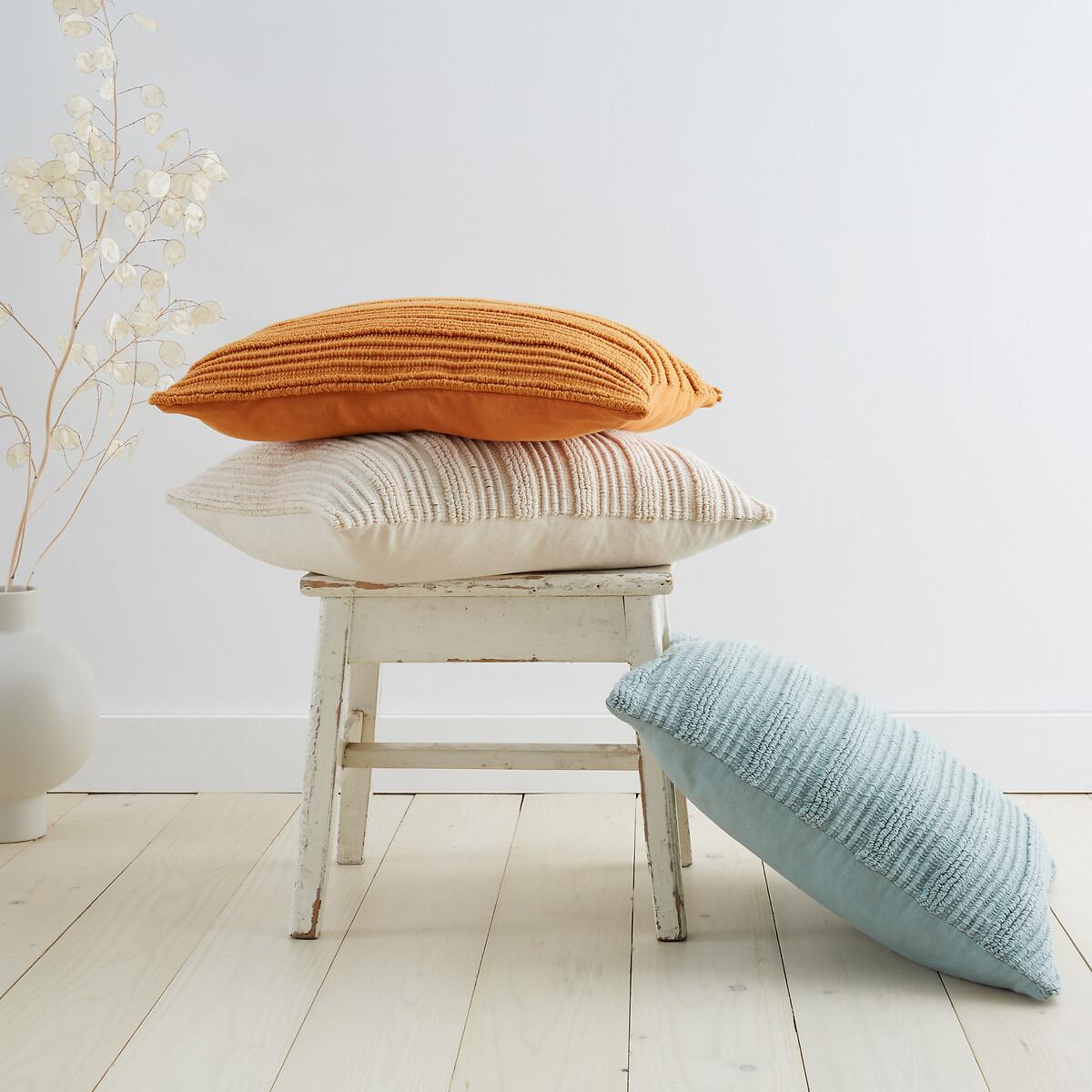 I really like this one for adding texture and a cosy, inviting feel to a sofa or bed. Its striped pattern works especially well in more relaxed, modern interiors, but it can also add a nice touch of warmth to neutral, minimalist spaces. The tufted design creates subtle visual interest without overwhelming, making it versatile for layering with other cushions. For styling, consider pairing it with solid-coloured or patterned cushions in complementary tones to create a balanced look. It's also practical to choose this cushion for everyday comfort thanks to its plush filling, making it both a stylish and functional choice.