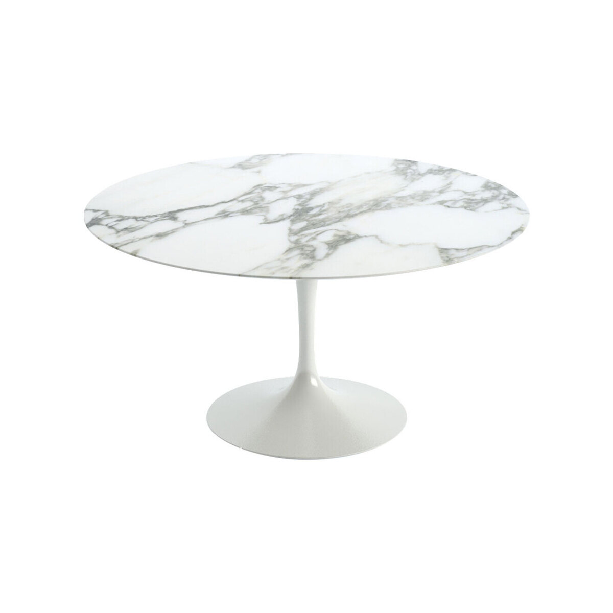 The Tulip Dining Table with an Arabescato marble top and white base is an icon of mid-century design, manufactured exclusively by Knoll and carrying Eero Saarinen's signature as a mark of authenticity. Conceptualised at the behest of mid-century modern design entrepreneur Florence Knoll, Saarinen vowed to address the "ugly, confusing, unrestful world" he observed underneath chairs and tables - a so-called "slum of legs. "A five-year design investigation led him to create the revolutionary Pedestal collection, first introduced in 1956. A hero product of the collection is this simple yet elegant Tulip Dining Table, whose sweeping silhouette provides the perfect antithesis to the typical clutter found under chairs and tables. The sturdy and sculptural white coated aluminium base sweeps elegantly from the floor to support a uniquely veined Italian Arabescato marble top, which is sealed with a transparent polyester coating to provide a stain-resistant and wipe-clean finish. View our entire range of Saarinen furniture here.
