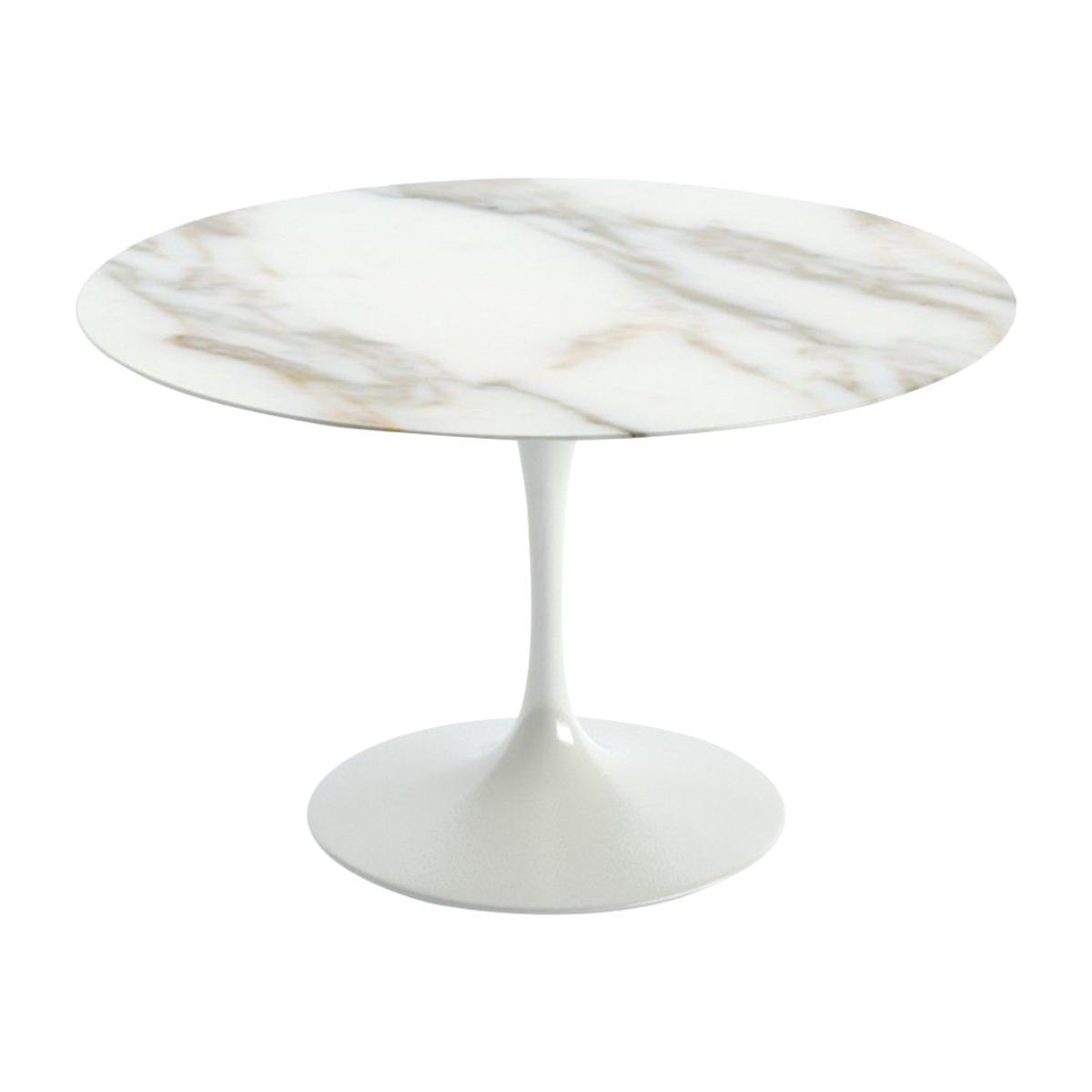 Considered one of the great icons of design, Eero Saarinen's multi-award-winning Tulip Dining Table is characterised by its instantly recognisable single stem and distinctive Calacatta marble finish. Designed in 1957 as part of the famous Pedestal collection that vowed to address the 'ugly, confusing, unrestful world' underneath tables and tables, the Tulip Dining Table consists of a sweeping base of die-cast aluminium, lacquered in black and coated with a protective Rilsan finish. The sturdy and sculptural coated aluminium base sweeps elegantly from the floor to support a uniquely veined Italian Calacatta marble top, accented with a glossy finish for a natural, honed appearance with protective properties, perfect for everyday use.