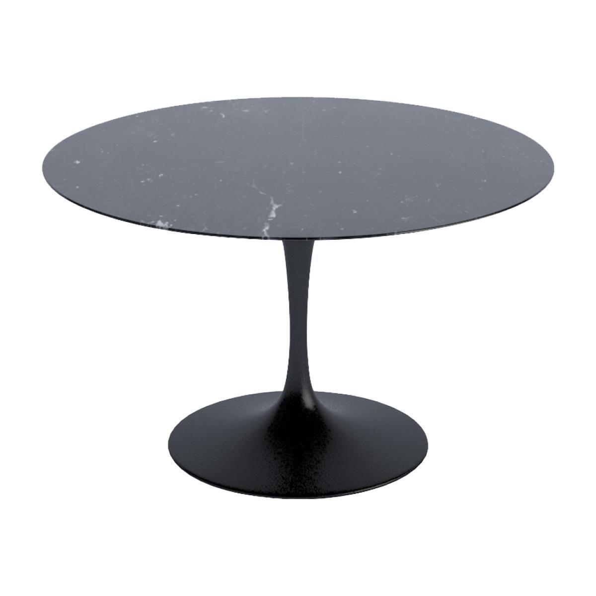 The Tulip Dining Table with a Nero Marquina marble top and black base is an icon of mid-century design, manufactured exclusively by Knoll and carrying Eero Saarinen's signature as a mark of authenticity. Conceptualised at the behest of mid-century modern design entrepreneur Florence Knoll, Saarinen vowed to address the "ugly, confusing, unrestful world" he observed underneath chairs and tables - a so-called "slum of legs. "A five-year design investigation led him to create the revolutionary Pedestal collection, first introduced in 1956. A hero product of the collection is this simple yet elegant Tulip Dining Table, whose sweeping silhouette provides the perfect antithesis to the typical clutter found under chairs and tables. The sturdy and sculptural black coated aluminium base sweeps elegantly from the floor to support a uniquely veined Spanish Nero Marquina marble top, which is sealed with a transparent polyester coating to provide a stain-resistant and wipe-clean finish. View our entire range of Saarinen furniture here.