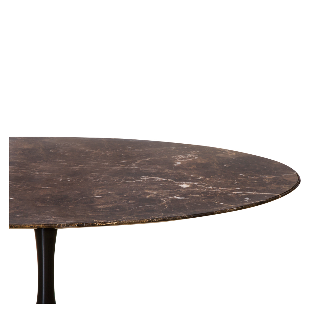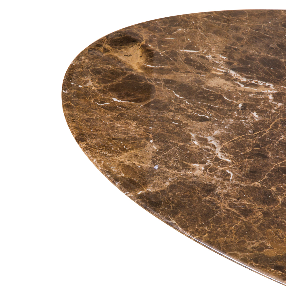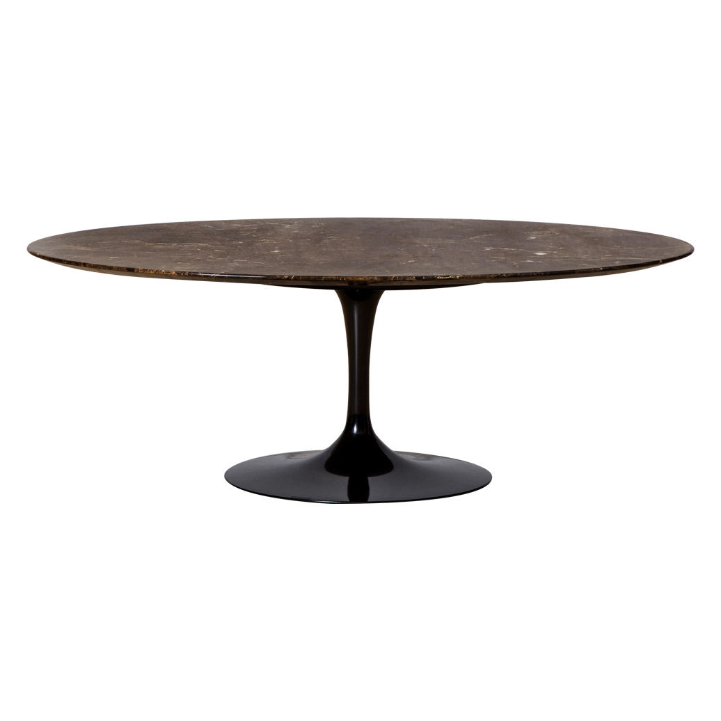 The Tulip Coffee Table with an Emperador marble top and black base is an icon of mid-century design, and is still to this day manufactured exclusively by Knoll, carrying Eero Saarinen's signature as a mark of authenticity. Conceptualised at the behest of mid-century modern design entrepreneur Florence Knoll, Saarinen vowed to address the "ugly, confusing, unrestful world" he observed underneath chairs and tables - a so-called "slum of legs. "A five-year design investigation led him to create the revolutionary Pedestal collection, first introduced in 1956. A hero product of the collection is this simple yet elegant Tulip Coffee Table, whose sweeping silhouette provides the perfect antithesis to the typical clutter found under tables. The sturdy and sculptural black coated aluminium base sweeps elegantly from the floor to support a uniquely veined Italian Emperador marble top, which is sealed with a transparent polyester coating to provide a stain-resistant and wipe-clean finish. Also available with a matte satin finish here.