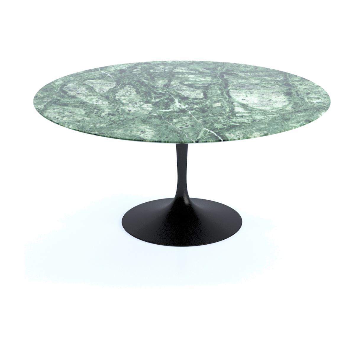 The Tulip Round Table with a satin-finish Verdi Alpi marble top and black base is an icon of mid-century design, manufactured exclusively by Knoll and carrying Eero Saarinen's signature as a mark of authenticity. Conceptualised at the behest of mid-century modern design entrepreneur Florence Knoll, Saarinen vowed to address the "ugly, confusing, unrestful world" he observed underneath chairs and tables - a so-called "slum of legs. "A five-year design investigation led him to create the revolutionary Pedestal collection, first introduced in 1956. A hero product of the collection is this simple yet elegant Tulip Table, whose sweeping silhouette provides the perfect antithesis to the typical clutter found under chairs and tables. The sturdy and sculptural black-coated aluminium base sweeps elegantly from the floor to support a uniquely veined Italian Verdi Alpi marble top, accented with a satin finish for a natural, honed appearance with protective properties, perfect for everyday use.