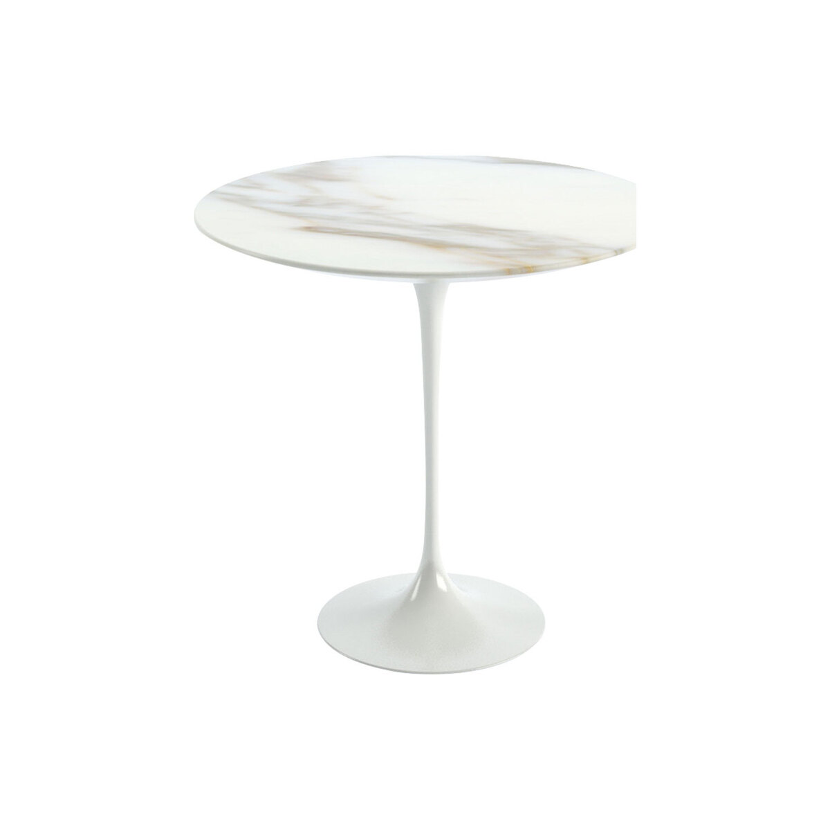 The Tulip Side Table with a satin finish Calacatta marble top is an icon of mid-century design, manufactured exclusively by Knoll and carrying Eero Saarinen's signature as a mark of authenticity. Conceptualised at the behest of mid-century modern design entrepreneur Florence Knoll, Saarinen vowed to address the "ugly, confusing, unrestful world" he observed underneath chairs and tables - a so-called "slum of legs. "A five-year design investigation led him to create the revolutionary Pedestal collection, first introduced in 1957. A hero product of the collection is this simple yet elegant Tulip Side Table, whose sweeping silhouette provides the perfect antithesis to the typical clutter found under chairs and tables. The sturdy and sculptural coated aluminium base sweeps elegantly from the floor to support a uniquely veined Italian Calacatta marble top, accented with a satin finish for a natural, honed appearance with protective properties, perfect for everyday use. View our entire range of Saarinen furniture here.