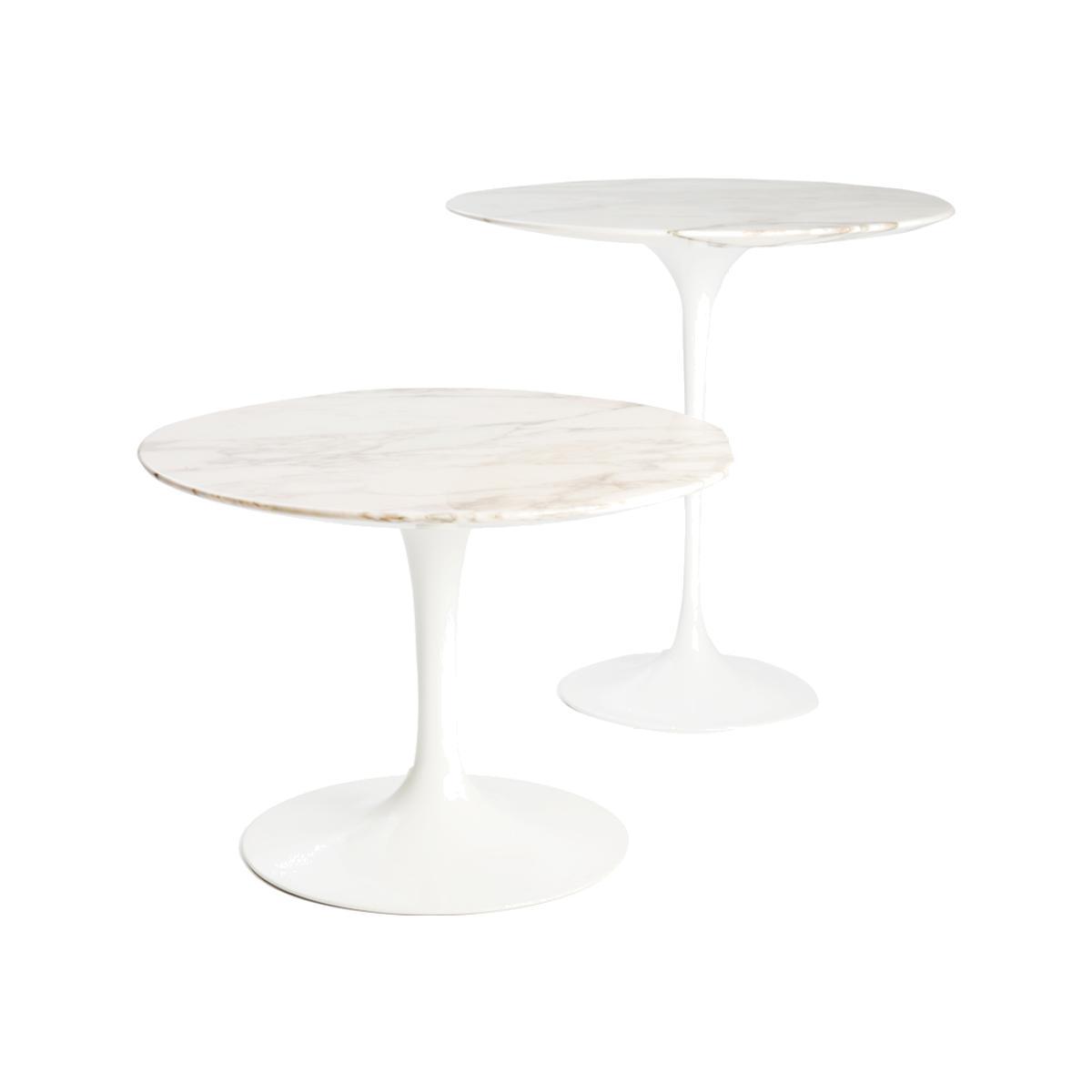 The Tulip Side Table with a satin Arabescato marble top and white base is an icon of mid-century design, manufactured exclusively by Knoll and carrying Eero Saarinen's signature as a mark of authenticity. Conceptualised at the behest of mid-century modern design entrepreneur Florence Knoll, Saarinen vowed to address the "ugly, confusing, unrestful world" he observed underneath chairs and tables - a so-called "slum of legs. "A five-year design investigation led him to create the revolutionary Pedestal collection, first introduced in 1956. A hero product of the collection is this simple yet elegant Tulip Side Table, whose sweeping silhouette provides the perfect antithesis to the typical clutter found under chairs and tables. The sturdy and sculptural white coated aluminium base sweeps elegantly from the floor to support a uniquely veined Italian satin Arabescato marble top, which is sealed with a transparent polyester coating to provide a stain-resistant and wipe-clean finish. View our entire range of Saarinen furniture here.