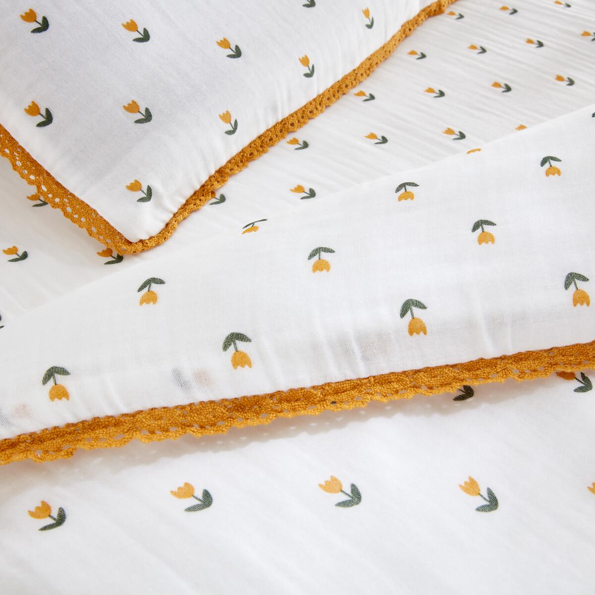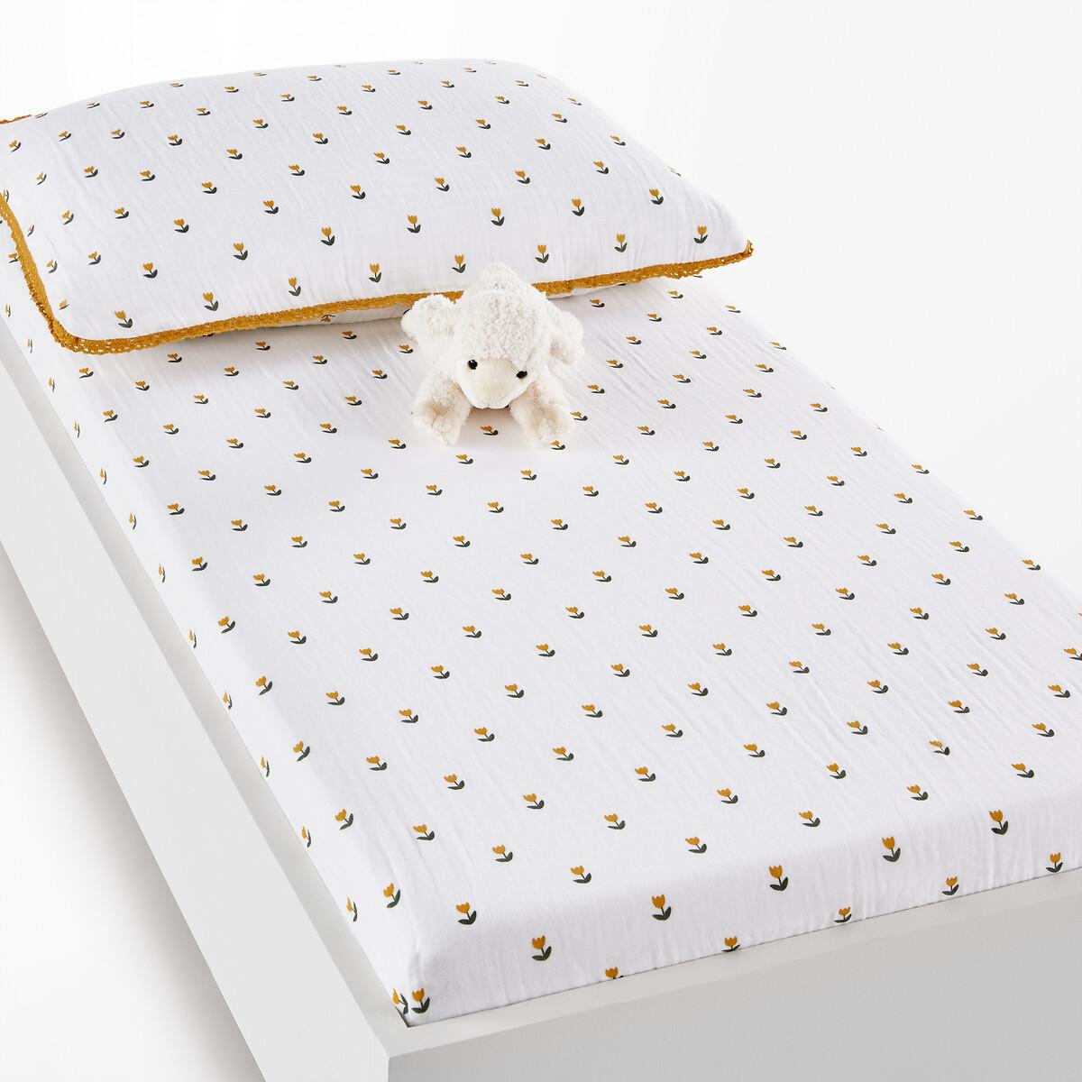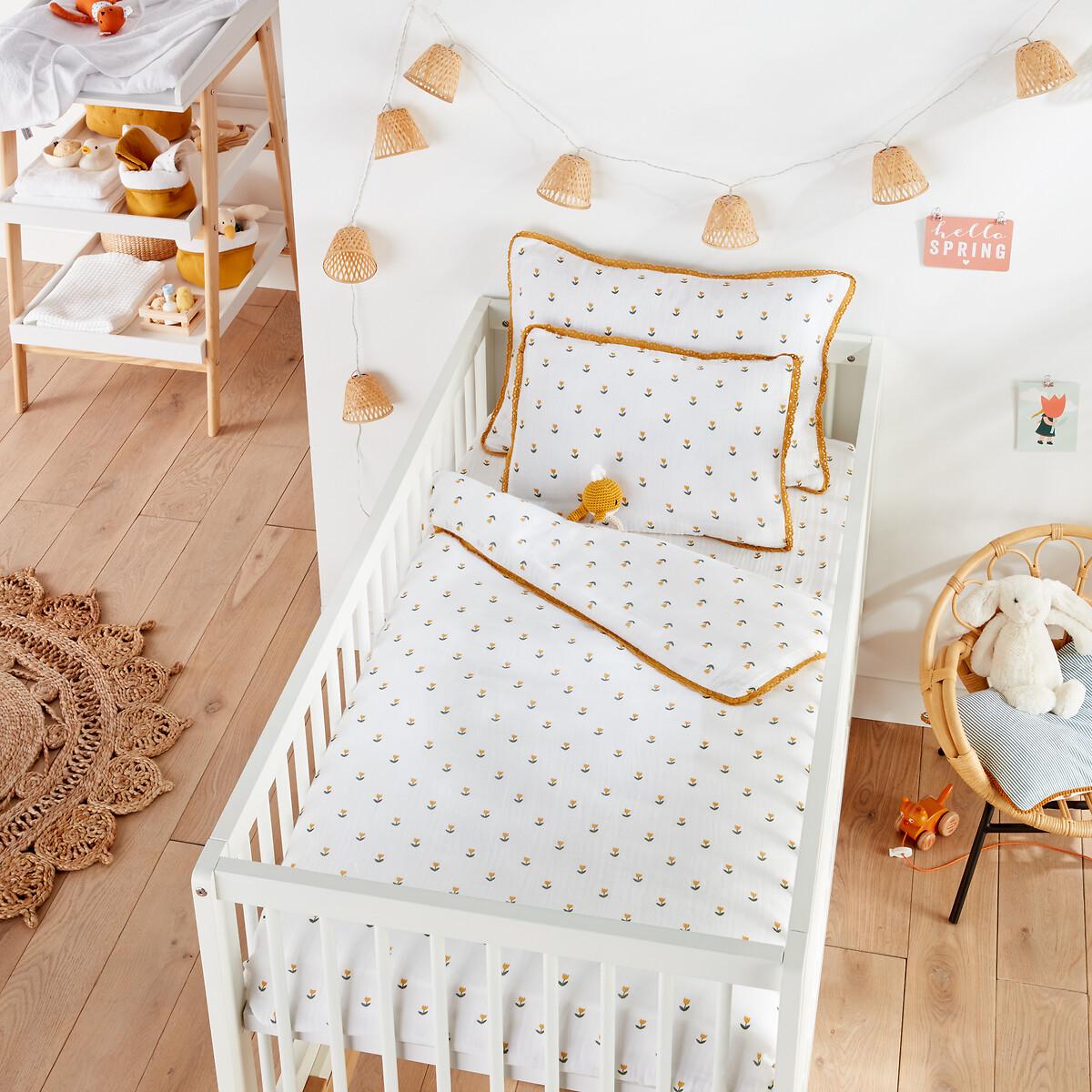 A floral pattern in super soft cotton muslin. The Tulipe set is patterned with mini tulip flowers. Soft, decorative and sweet. Cotton muslin is light, supple and super soft. Naturally textured, they do not require ironing and become more beautiful over time. Product Details • 100% cotton • For mattress height 17cm • Patterned with tulip motifs. Care Advice • Machine washable at 60°C • By washing your laundry at 40°C instead of 60°C, you limit energy consumption • Product will regain its texture after tumble drying. Dimensions • 60 x 120cm: Cot bed • 70 x 140cm: Adjustable bed • OEKO-TEX® Standard 100. Standard 100 certification by OEKO-TEX® tests textile products for harmful substances via an independent, international label.