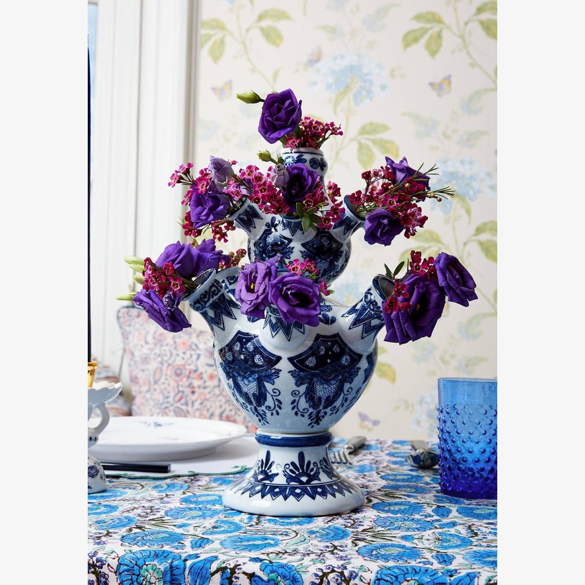 I love this tulipiere because of its striking silhouette and classic blue and white pattern that instantly elevates a space. It’s perfect for showcasing seasonal flowers or a simple yet impactful centrepiece on a dining table or sideboard. The pyramid shape lends itself well to creating height and interest in rooms with open shelving or mantel displays. For styling tips, try varying the height and type of blooms to add visual texture, and consider pairing it with complementary ceramics or textiles in similar tones for a cohesive look. This piece works particularly well in traditional, coastal, or eclectic interiors, where it can add a pop of colour and pattern while still feeling timeless.