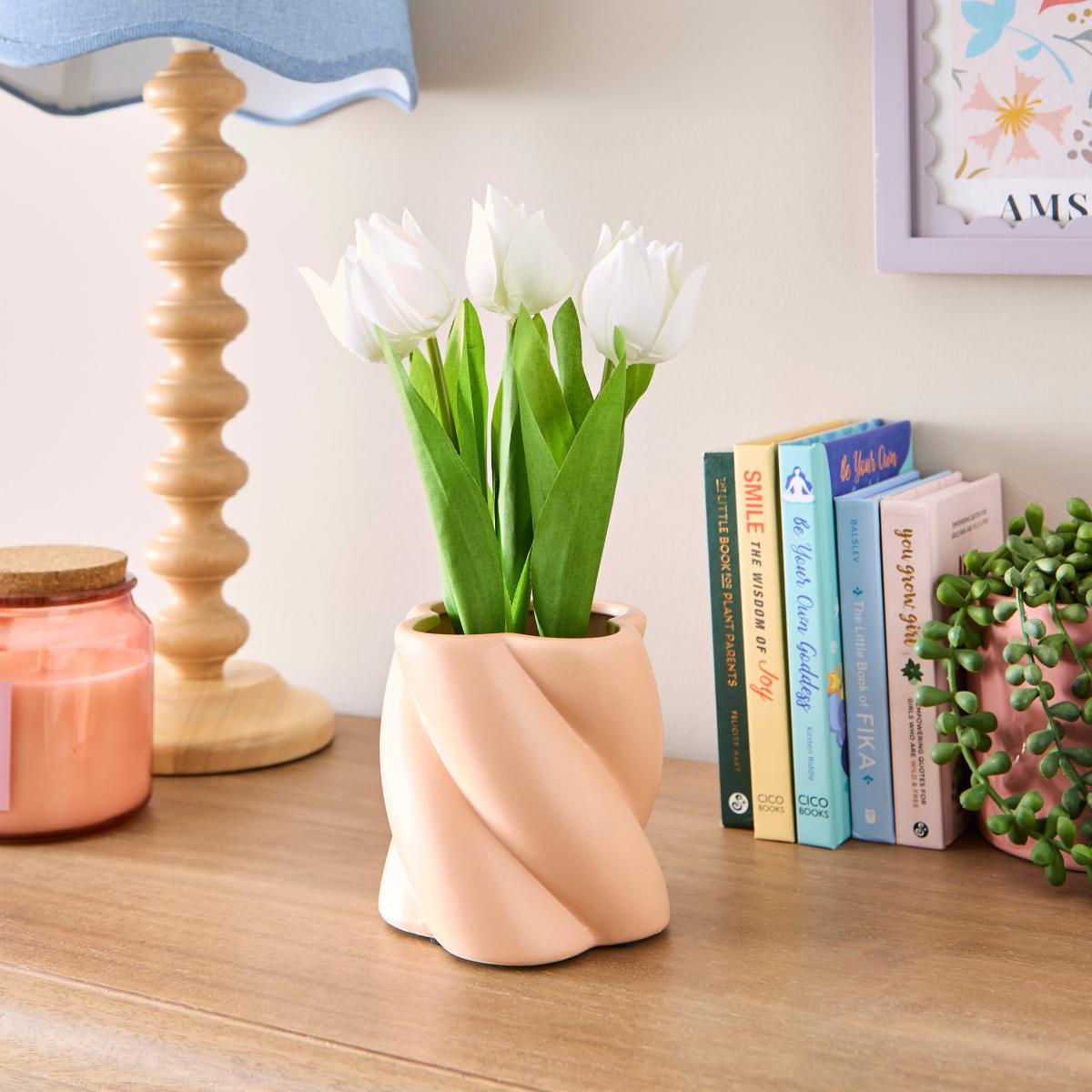 * Low maintenance * Beautiful decorative item * Lovely gift idea * Available in two colourways Add a floral flourish to any room with our beautiful Tulips in Twist Vase. These low-maintenance, realistic potted flowers bring luscious blooms all year round without the need for watering. Perfect for brightening up any room, they make a stunning decorative item that’s sure to catch the eye. Displayed in a stylish ceramic pot with a unique twist design, these tulips offer timeless elegance. A beautiful way to introduce colour and charm into your home, with no fuss or hassle. Let these gorgeous flowers bloom forever in your space.