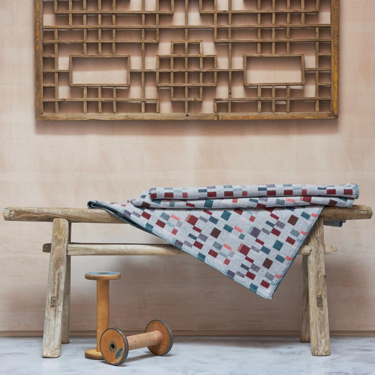 The Tuluk design is a collaboration with Carlowrie Castle to celebrate the life of the intrepid Edwardian explorer Isobel Wylie Hutchison. Isobel journeyed across Greenland documenting the Inuit tribes and the flora and fauna she encountered. This blanket was borne out of her beautiful watercolour sketches and intricate patterns on the Inuit ceremonial cape she wore. Tuluk is the affectionate name given to her by the Inuits. This collection is inspired by extraordinary female explorers and their sketchbooks. This collection evokes an artist’s palette much like the watercolours used by these women on their expeditions. The harsh environments limited what they could carry on their journeys reducing the variability of colour, which is demonstrated in the tonal hues of the design.