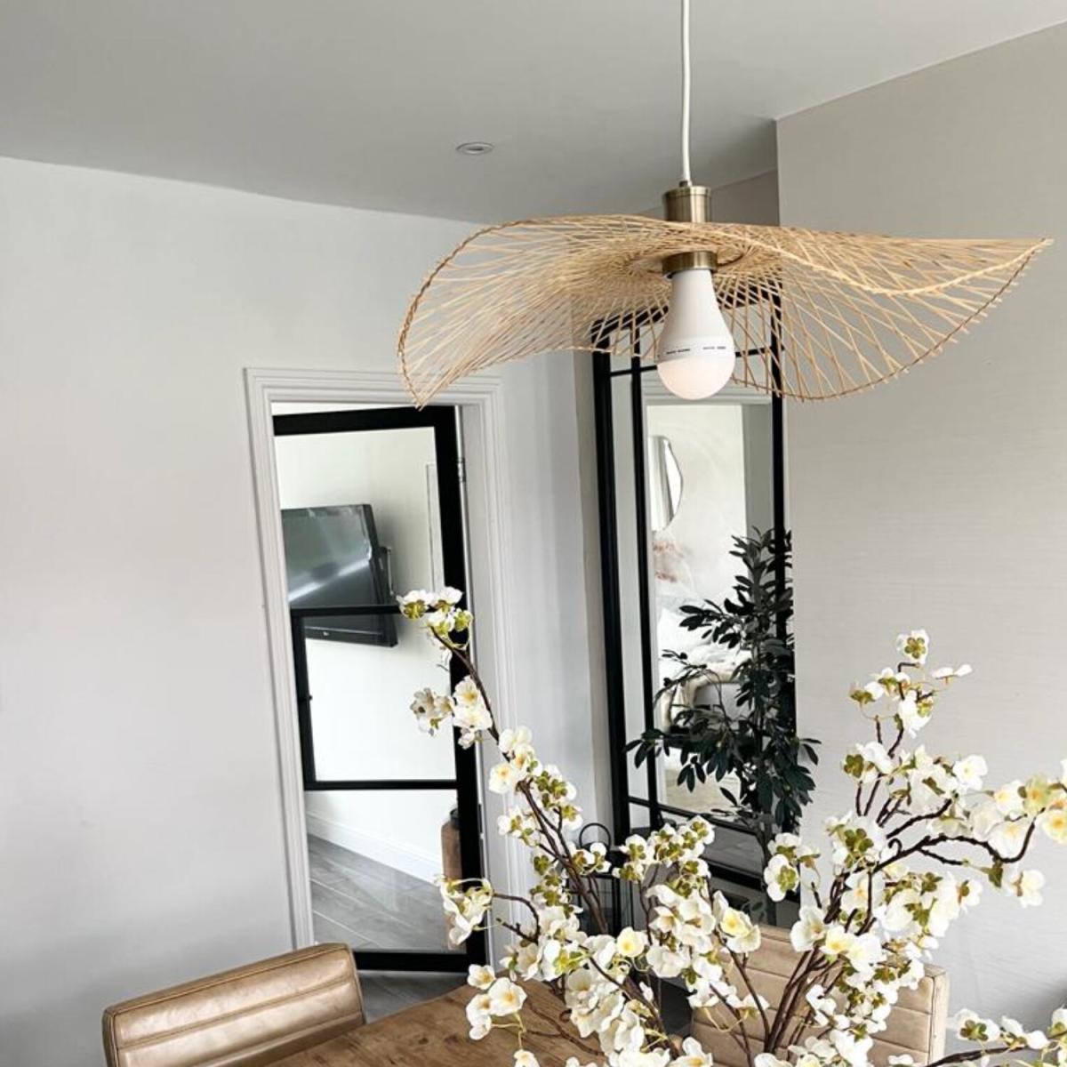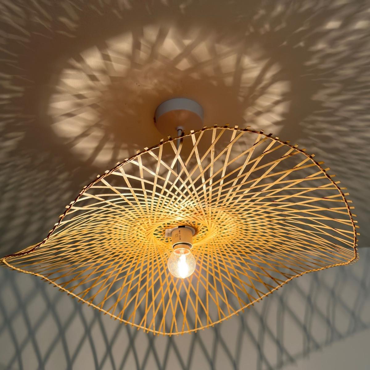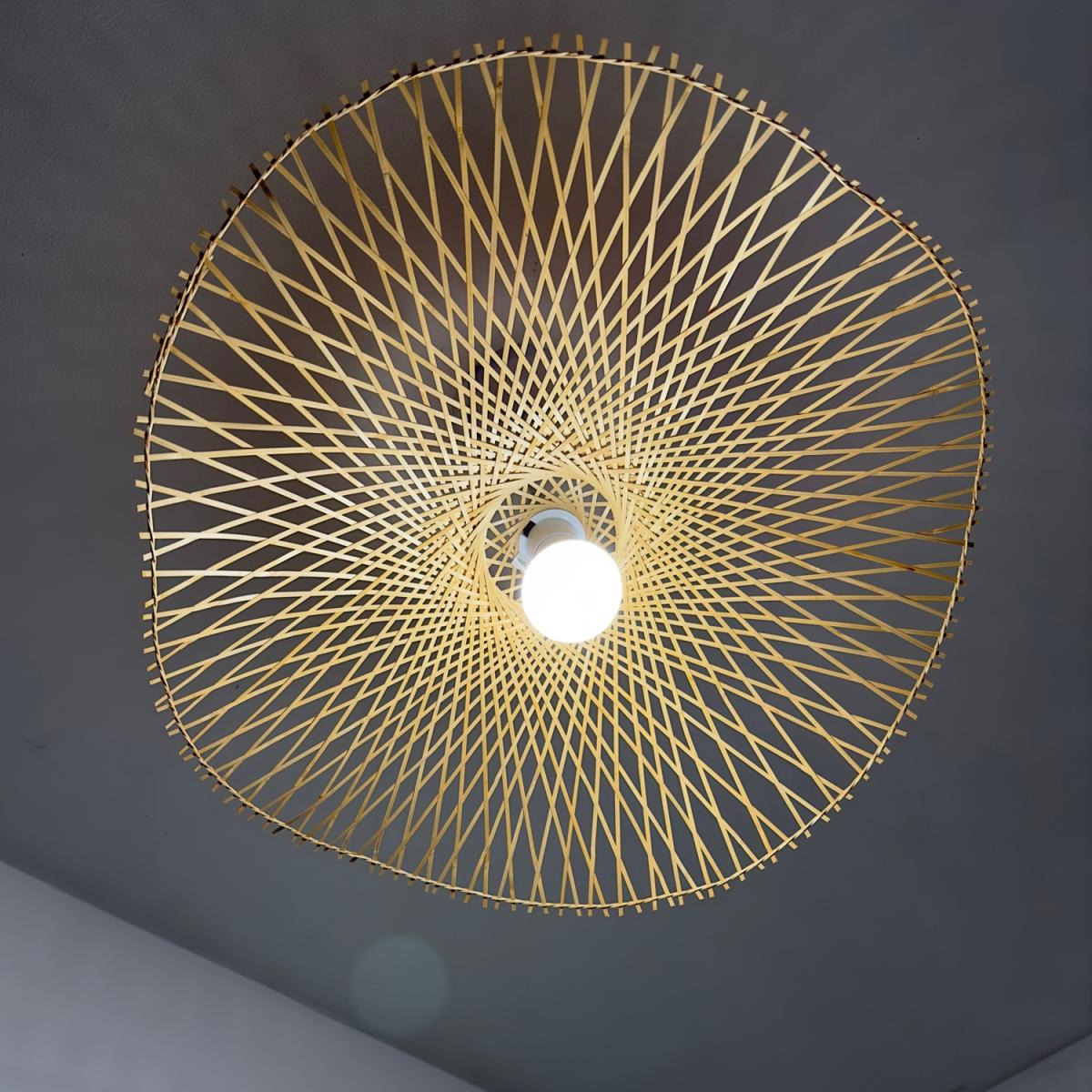 I really like this bamboo lampshade because it adds a natural, earthy touch to any space. Its large size makes it a statement piece, especially effective in open-plan rooms or high ceilings where it can be showcased without overwhelming the area. It works particularly well in boho, coastal, or Scandinavian interiors, complementing neutral palettes and organic textures. For styling tips, consider pairing it with warm-toned filament bulbs to enhance its warm glow, and hang it over dining tables or in living rooms where the patterned light can cast interesting shadows, creating cosy, inviting atmospheres.