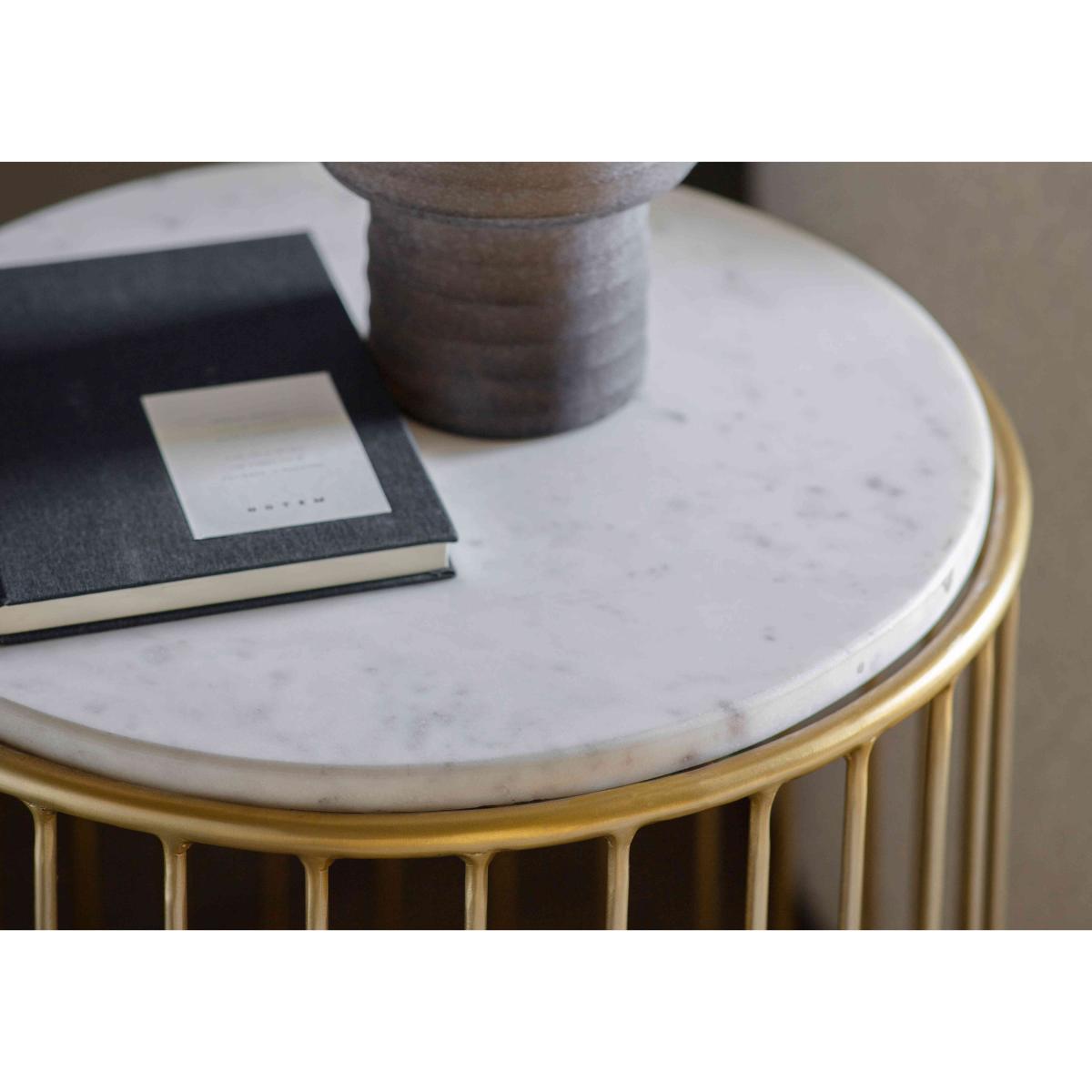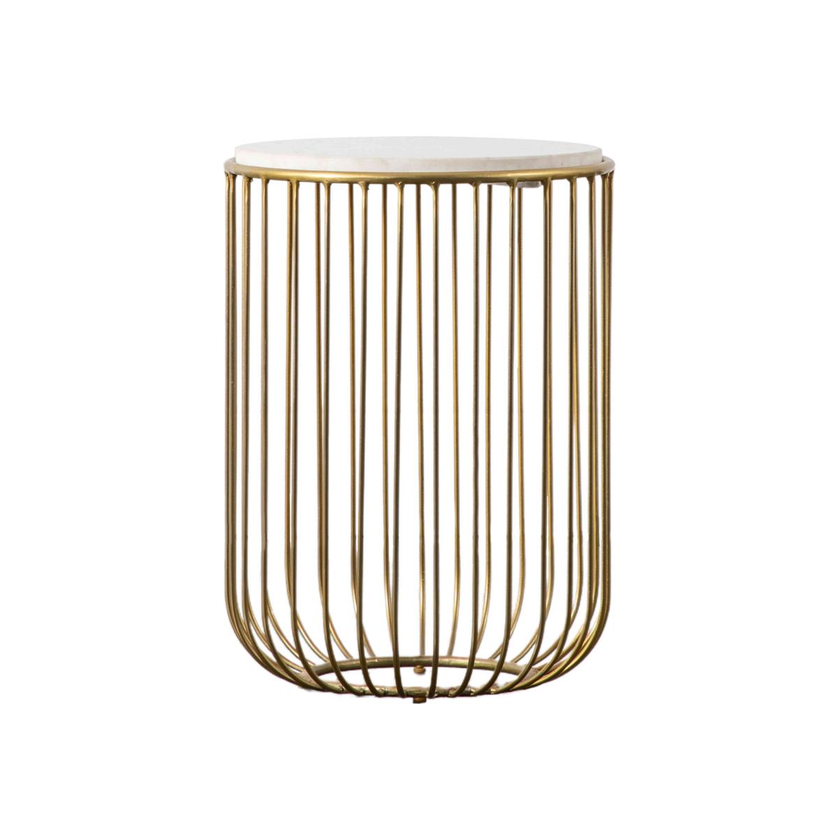 Your home will love this sophisticated side table. Unashamedly glam, it will elevate your interior to new levels of style. Why you'll love it Distinctive fine wire metal base with brushed brass finish. Statement white marble top is sure to impress. Matching coffee table available. Also available with black base. What you need to know Made from iron and marble. We recommend always using coasters. For indoor use only. Dimensions Width: 38 cm (15 inches) Height: 51 cm (21 inches) Depth: 38 cm (15 inches) Weight: 15.6 kg
