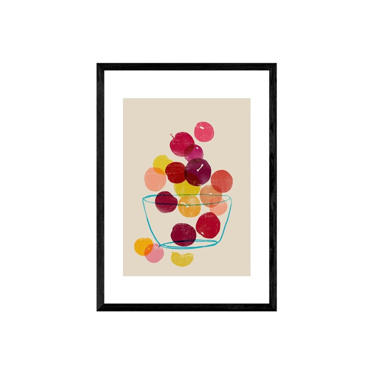 The contrast between the blue lines of the bowl with the tumbling fruit is the perfect balance in this colourful yet subtle composition. The jewel tones of the plums interlaid on top of one another give a gorgeous layering effect, ideal for kitchens. Only giclée printing processes are used for this print resulting in the highest quality museum-level colours and sharpness. Choose between a number of different coloured frames and three sizes for the perfect print for your space.