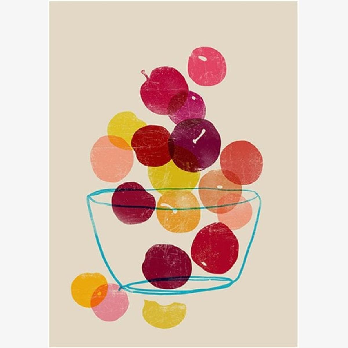I loved this piece for its playful, modern feel. The bright, bold plums bring a pop of colour that can energise a room, making it a great statement in a neutral or minimalist space. It works especially well in kitchens, dining areas, or casual living rooms where a lively, contemporary vibe is desired. To style it effectively, consider pairing it with simple, clean-lined furniture and perhaps some coordinating accessories in similar hues. Hanging it at eye level in a prominent spot will ensure it becomes a focal point, while the unframed finish keeps the look fresh and uncluttered. Keep the surrounding decor understated to let the artwork truly stand out.
