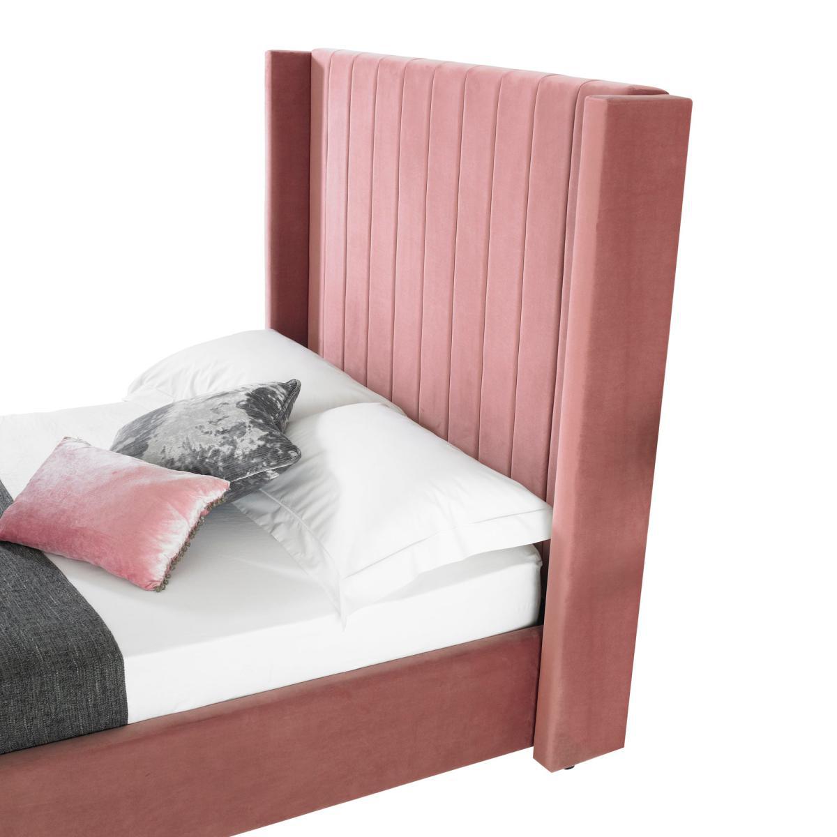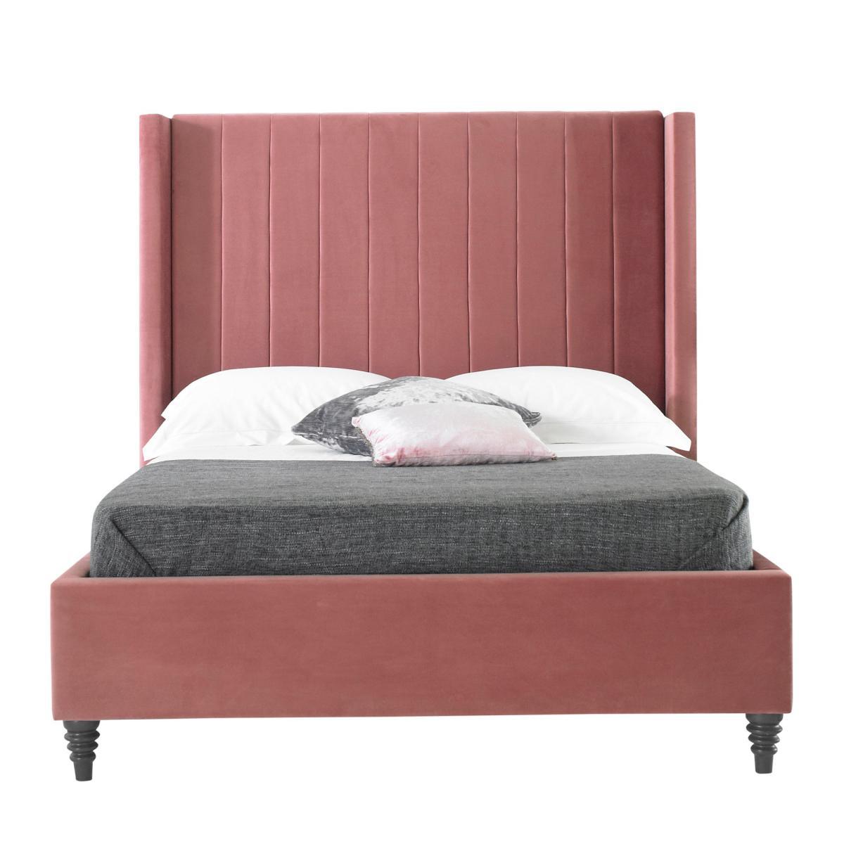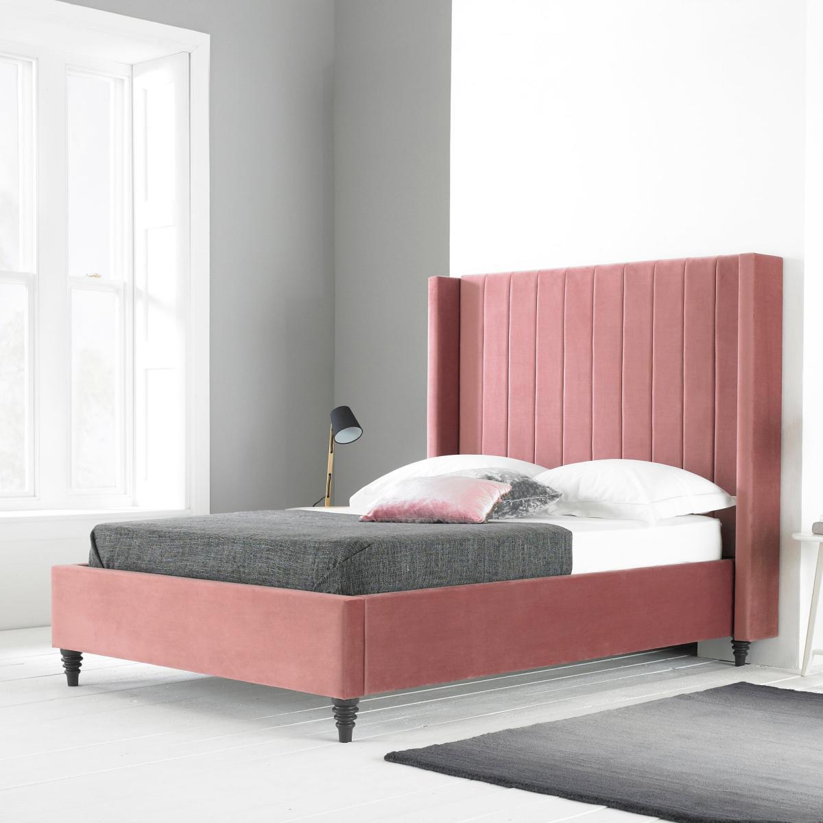 Upholstered in a luxurious plush velvet fabric in a trendy blush colourway, the Turin contemporary bed frame features a winged tube headboard complete with sumptuous foam cushioning and turned, solid wood feet. This self-assembly bed frame is built on a sturdy wood and metal frame, complete with pre-installed fittings for easy assembly and is supplied with grey, black and blue painted feet to allow you to decide on the best look for you. Please note, unfortunately we cannot deliver this item to Northern Ireland or the Channel Islands.