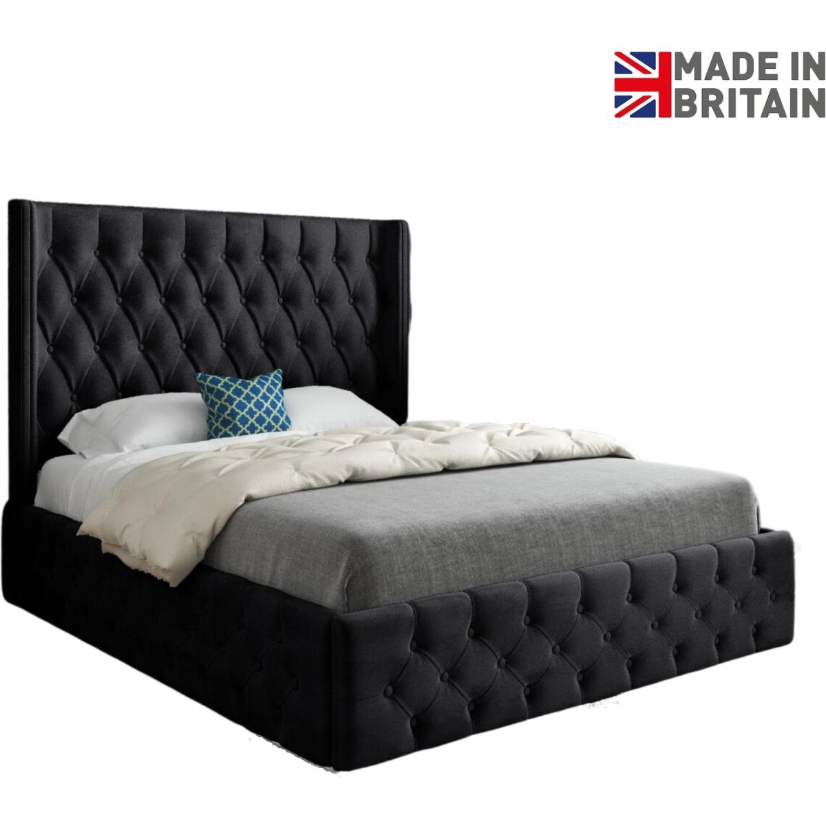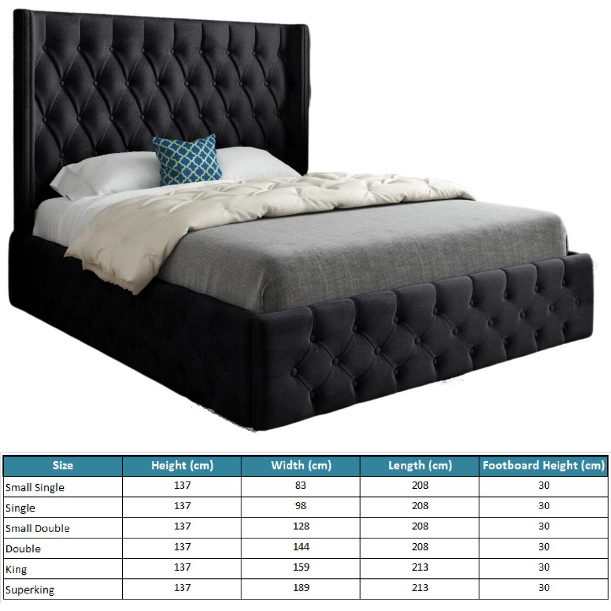 This Spectacular Winged bed is the older sophisticated brother of the Florence and oozes infinite luxury and class. Classic Chesterfield design with Pleated headboard upholstery and pleated siderails with matching footboard. The straight wings finish perfectly above the siderails and are finished in a choice of beadingstuds to complement the fabric. Also available without studs depending on your interior needs. The delicate button detailing provides you with a sumptuous padded surface to help you relax whilst reading in bed. The bed comes with a solid slatted base for mattress longevity and and supreme ventilation.