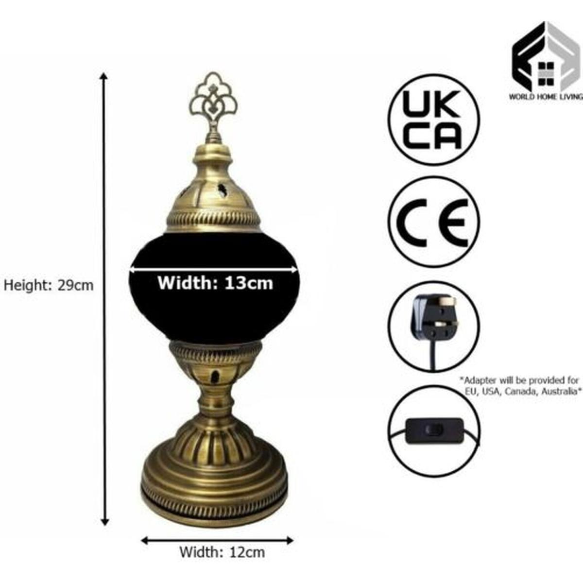 These beautifully handcrafted table lamps, exclusively by World Home Living, create light that beautifully blends into many different environments and settings. All lamps supplied by World Home Living conform to strict CE and UKCA standards. Similar lamps that are cheaper or bought in Turkey are not built to the required quality. Not only does the lamp feature a distinctive metal design, providing for a more stable and solid base, but the glass is stained and not painted. This ensures the lamp retains its beauty and quality.