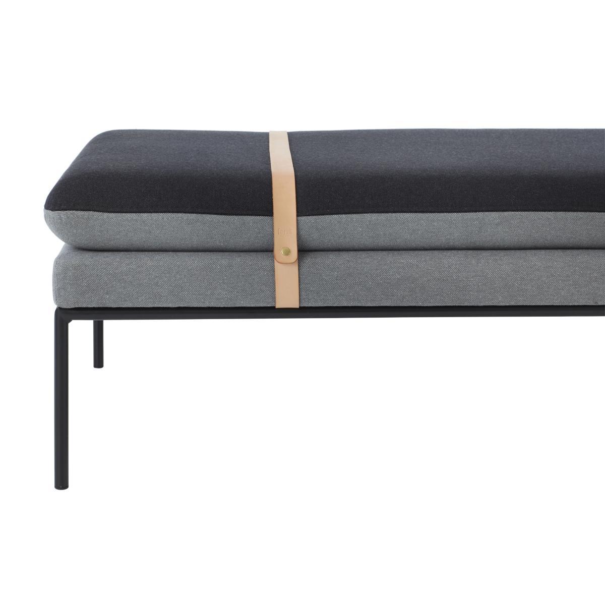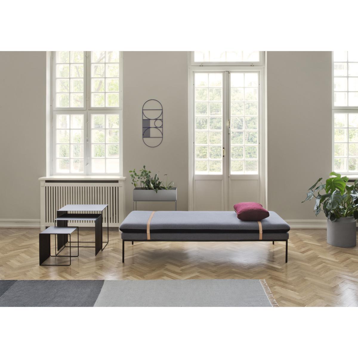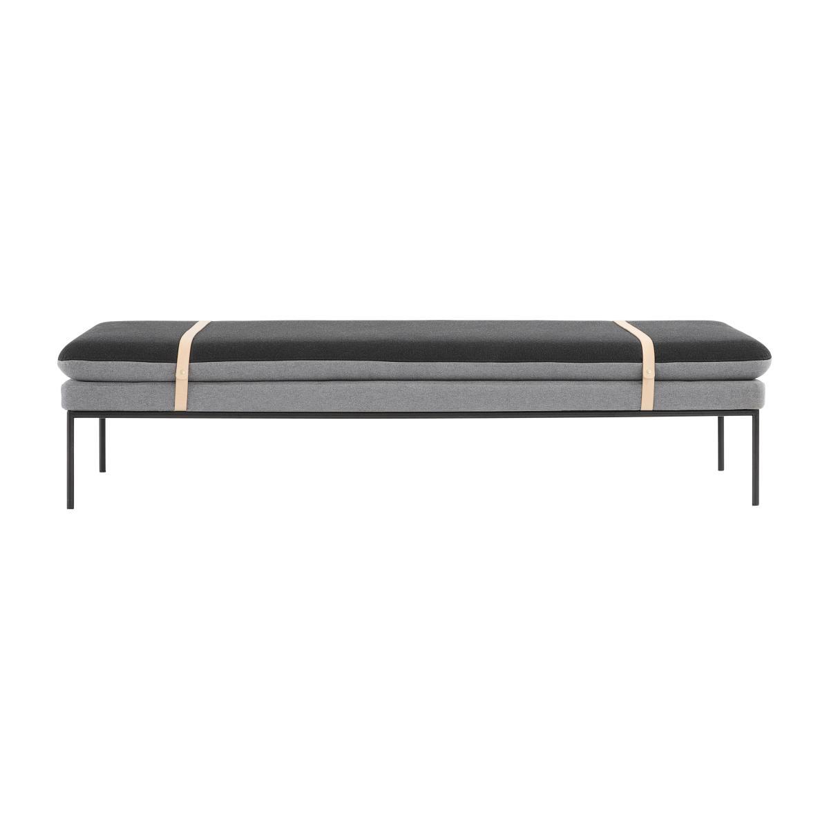 Turn is an elegant chaise longue, as feminine as it is refined, composed of a linear seat carried by thin legs in epoxy lacquered metal. The upper cushion is held on the structure by two light beige leather straps which add to the character of a model with a particularly neat look. Remove the straps to change the look of your chaise longue to suit your desires, to have a uniform or two-tone look, thanks to the reversible cushion positioned on the seat. The double stitching reinforces the contrast between the two tones in question, while demonstrating the care that Ferm Living gives to its finishes.