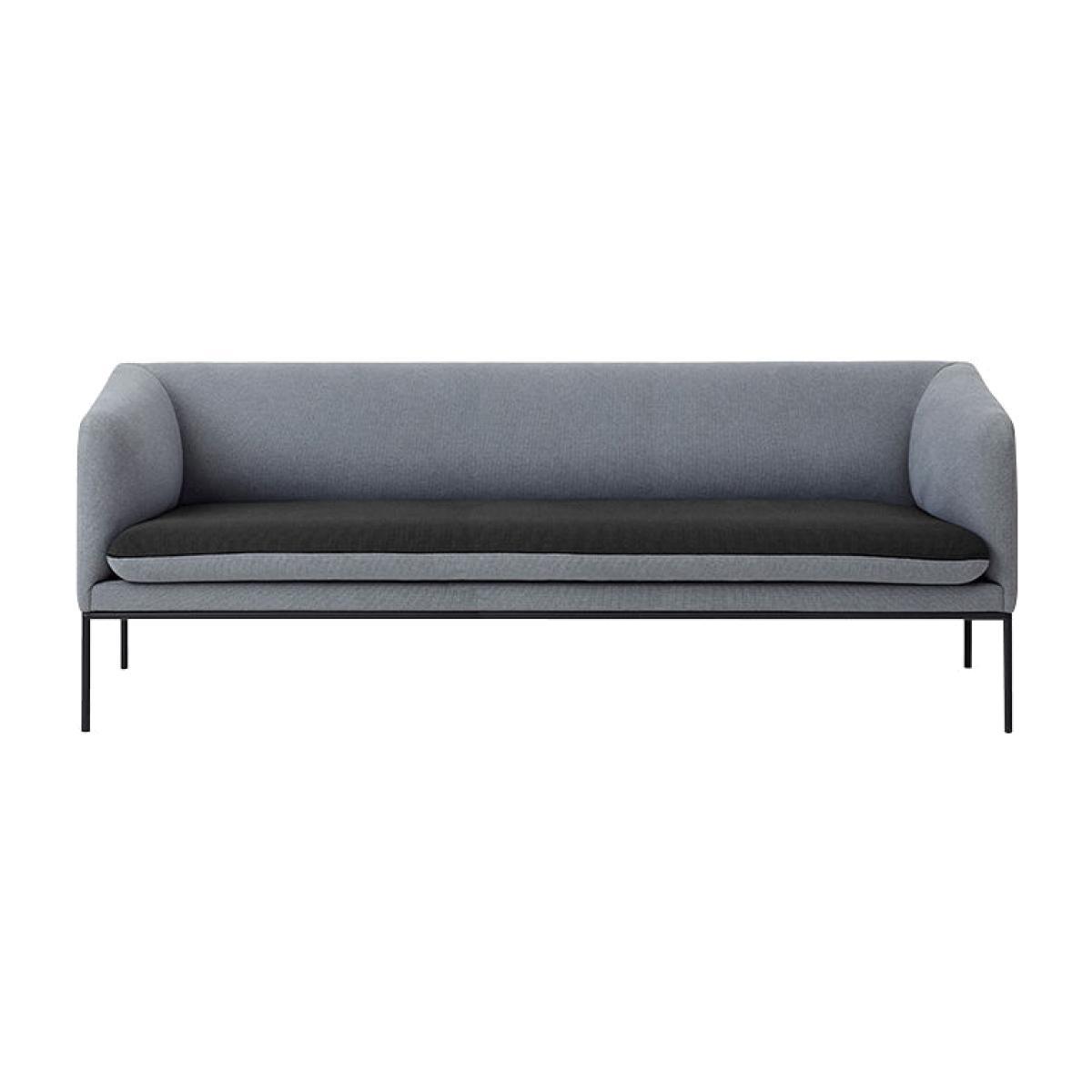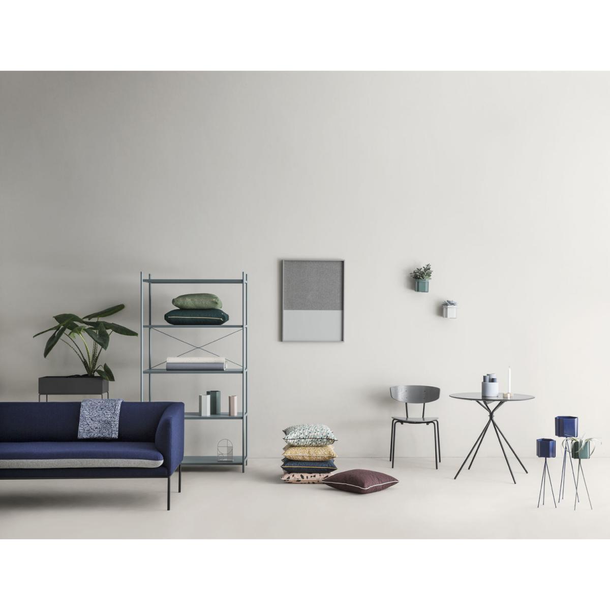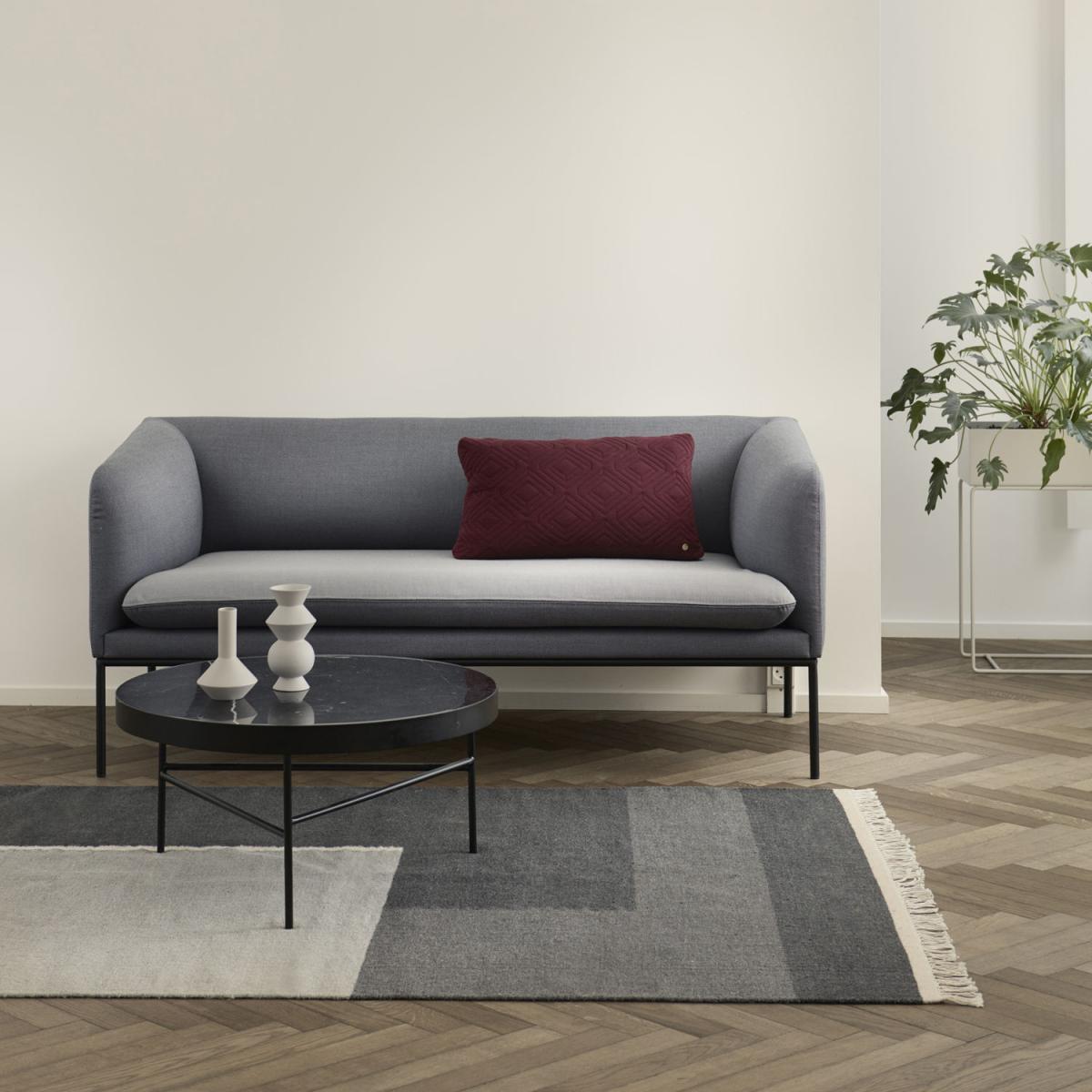 Turn is an extremely elegant sofa with simple, sleek lines. Very smart, this sofa can change its look as you wish thanks to the reversible two-tone seat cushion. Just flip the cushion over to change its colour: you can go for a monochrome, plain finish or a harmonious combination of colours. The double stitching reinforces the contrast between the two tones in question, while demonstrating the care that Ferm Living gives to its finishes. This Turn sofa displays a beautiful effect of contrast between an exterior design that’s both sculptural and rigorous, and an inviting seat, with rounded inner edges. Inspired by vintage design, the frame and slim legs of the sofa are epoxy lacquered metal. The upholstery is made of a beautiful fabric, a mixture of cotton and polyester.