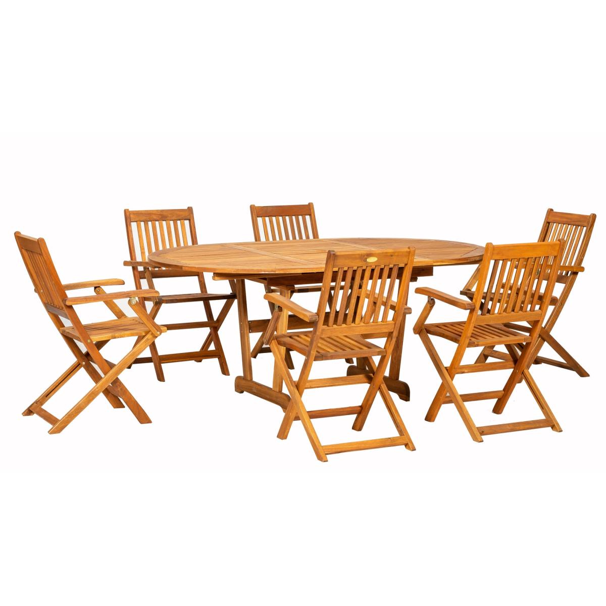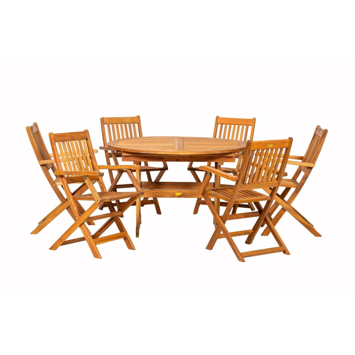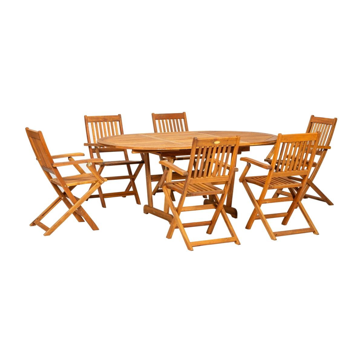 A stunning addition to your garden during the summer months, this Turnbury dining set comes complete with a large table and six sturdy chairs. Ideal for hosting dinner parties or relaxing in the sun, this dining set has been crafted from quality wood and finished in a brown colourway suitable to compliment any outdoor space. This set can easily be stored as the chairs fold away. Please Note: Seat pads and parasols sold separately.