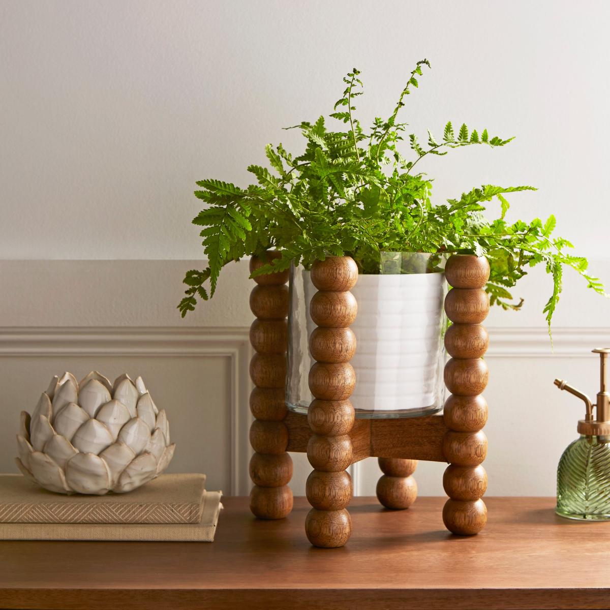 I really like the turned wood pot in this setting - it adds a warm, natural touch that works well with both contemporary and boho interiors. Its neutral tone and textured design make it versatile, so it can be styled with a range of plant types and colour schemes. To maximise its visual impact, consider pairing it with lush, leafy plants or trailing varieties that can spill over the sides. It also works well as a statement piece on sideboards or shelves, especially when combined with other natural materials like rattan or woven textiles. For practical styling, placing the pot on a textured tray or stand can elevate the look while protecting surfaces.