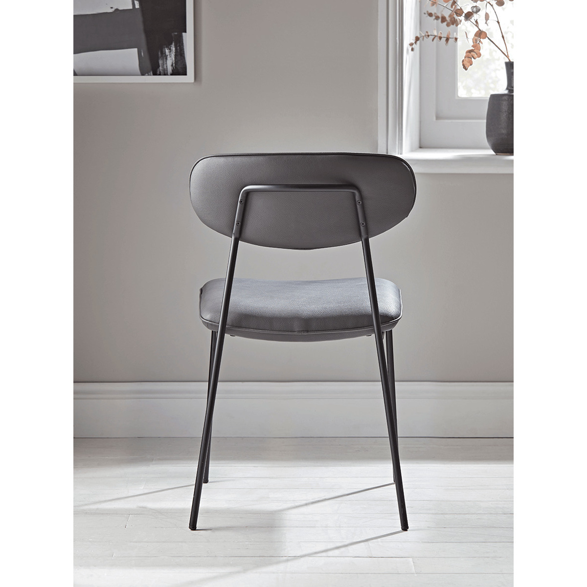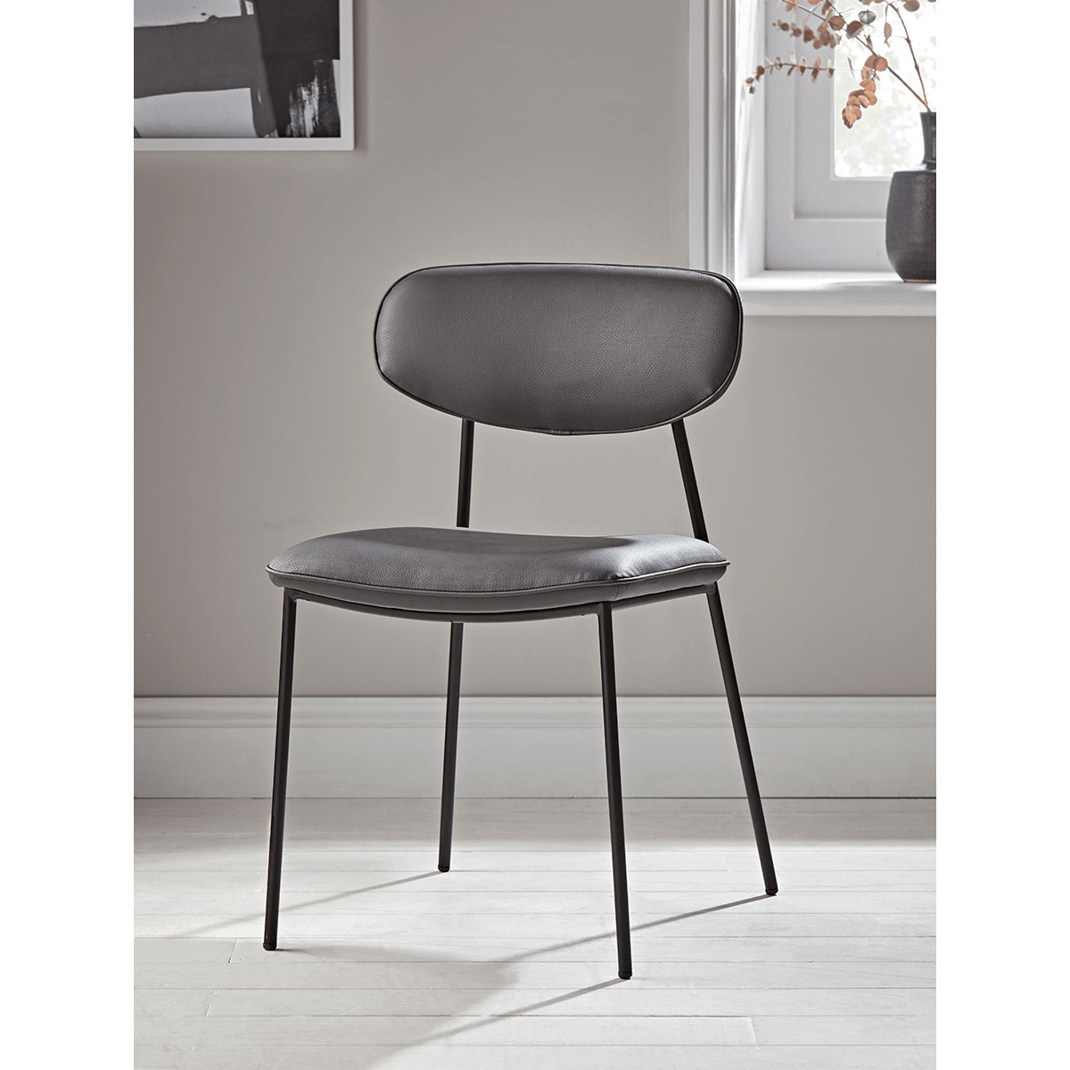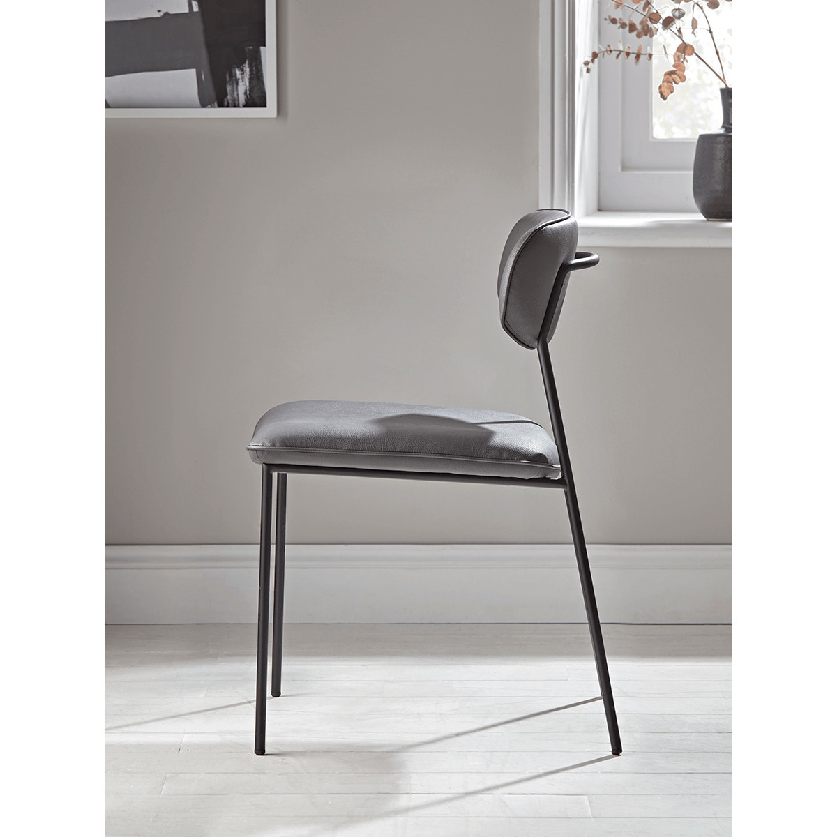 With a modern, pared back silhouette our Turner Dining Chair comes upholstered in faux leather, a comfortable seat and soft back rest. A mid century style but with a contemporary slender metal frame. Place at your dining table for a modern finish to your table, with a lighter tone to most upholstered seats, our chairs will not weigh down your look.