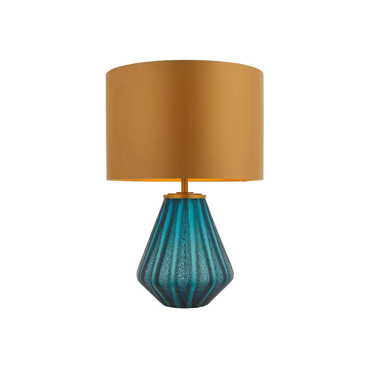 This Table Lamp is a great lighting solution featuring turquoise tinted glass & a gold satin fabric shade. Inline on/off switch with black fabric flex and compatible with E27 LED lamps. H53 X W36CM.. This product will be dispatched by one of our trusted suppliers. You’ll be contacted by their selected courier about your delivery.