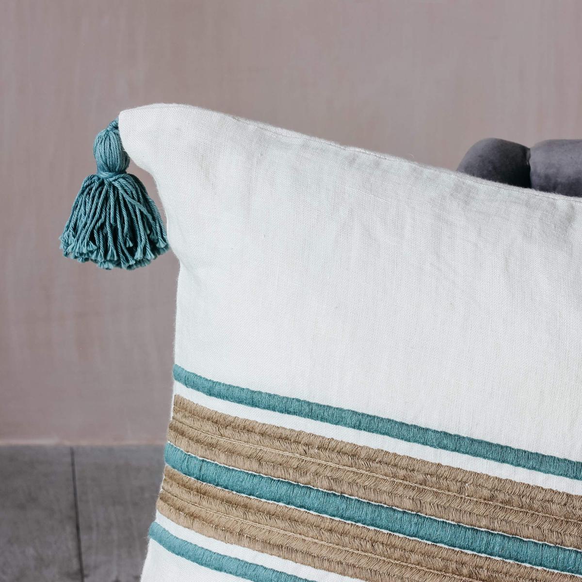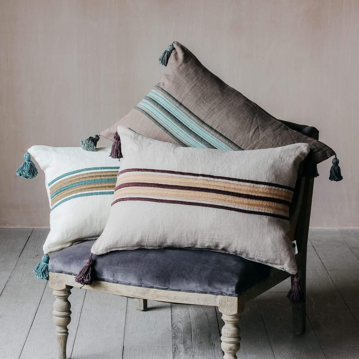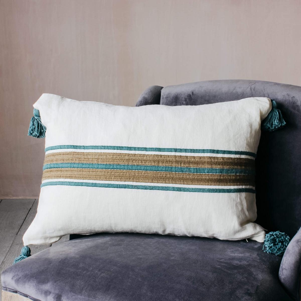 Woven from linen and cushion with subtle blue stripes and matching tassels, add some texture and pattern to sofas and benches with this bohemian-inspired cushion.