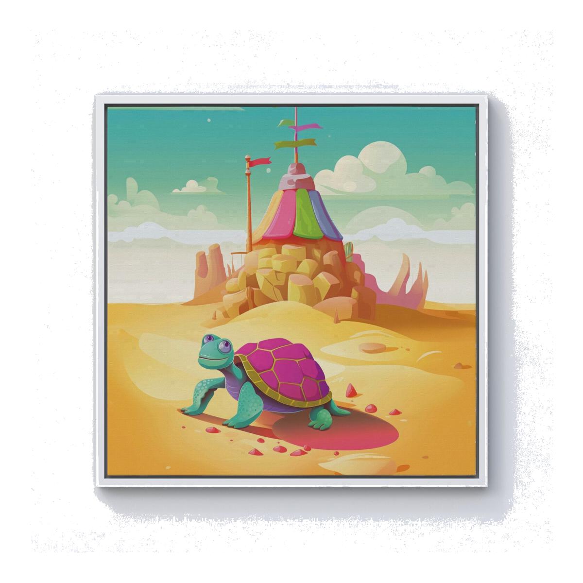 Turtle On A Beach Holiday Canvas Print - Yellow / White Frame / 25.4cm