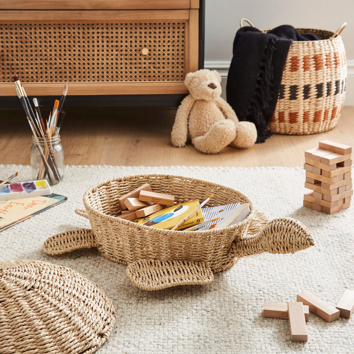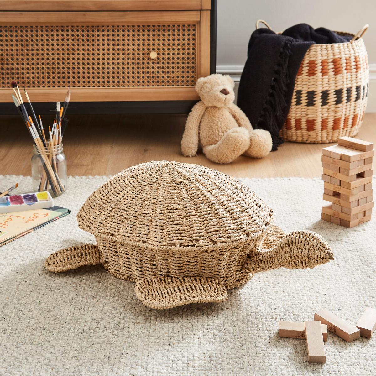 I love this turtle paper rope basket as a practical yet stylish storage solution for children's rooms. Its natural, earthy tones make it a versatile addition that works well in Scandi, boho, or coastal interiors. Great for storing toys, books, or even laundry, it adds a tactile element that children find appealing. To style it effectively, try pairing it with other natural textures like cotton or linen, or place it alongside open shelves or a cosy reading nook to create a relaxed, inviting space. Its playful turtle design also injects a subtle fun element without overwhelming the overall decor.