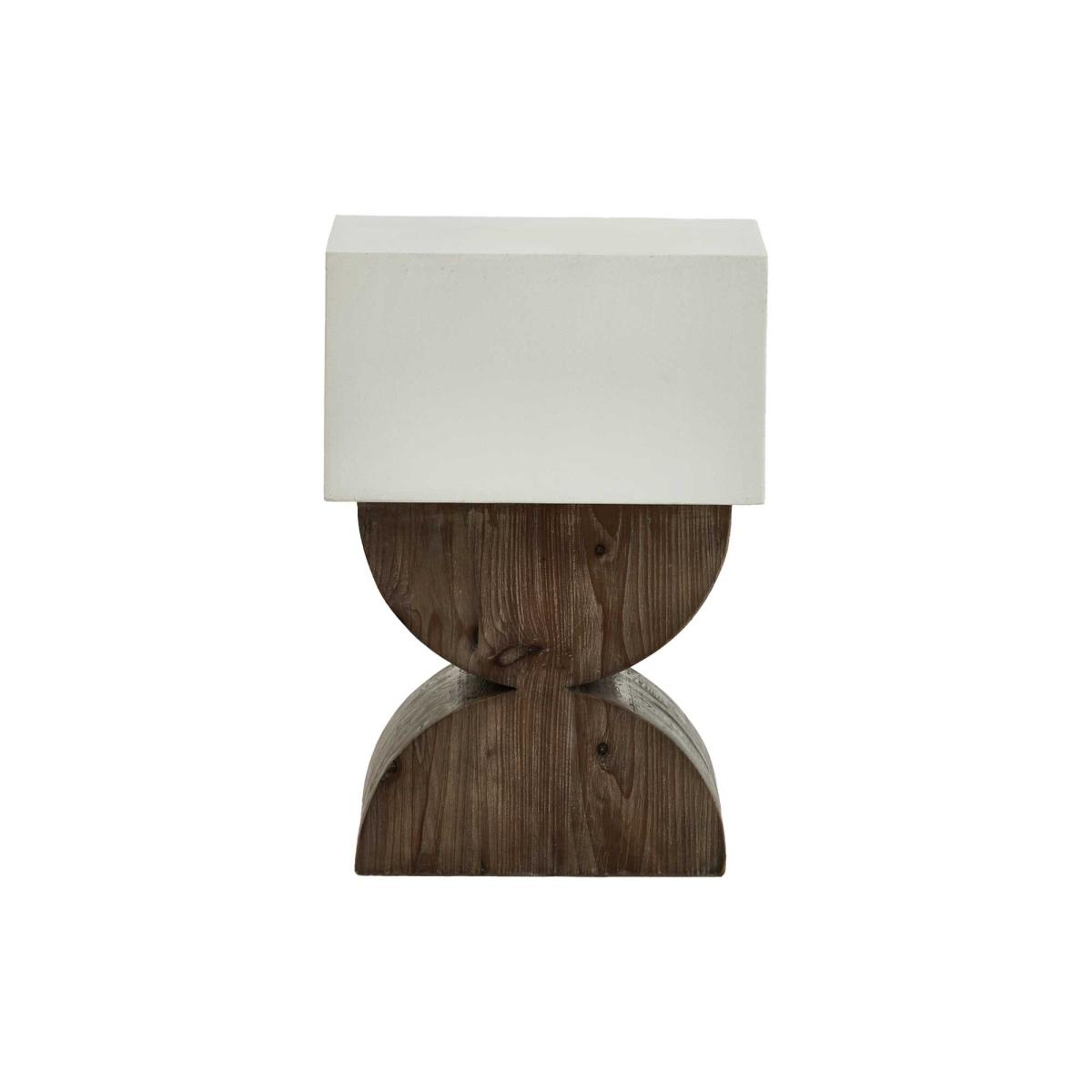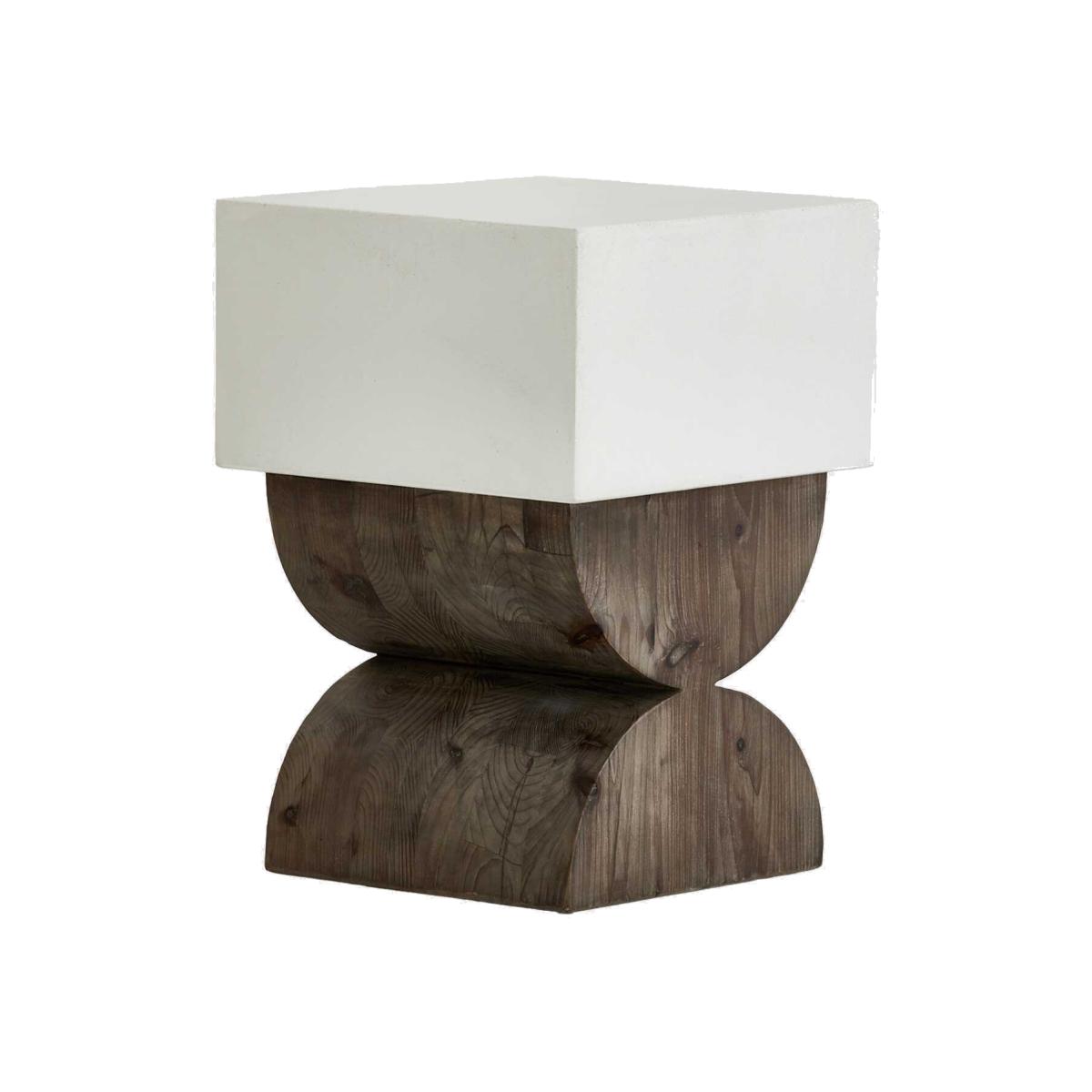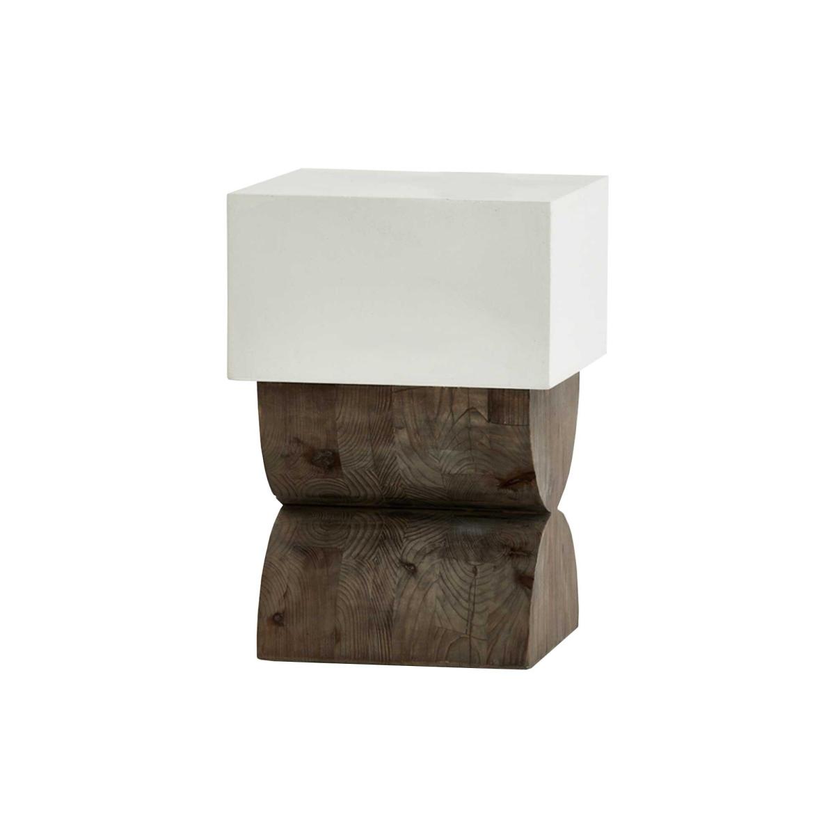 This sculptural side table features a solid pine wood base with a curved silhouette and a crisp white concrete top. The contrast of natural wood grain and smooth concrete creates a bold, modern statement. Compact and eye-catching, it's perfect as a functional accent in living spaces or bedrooms.