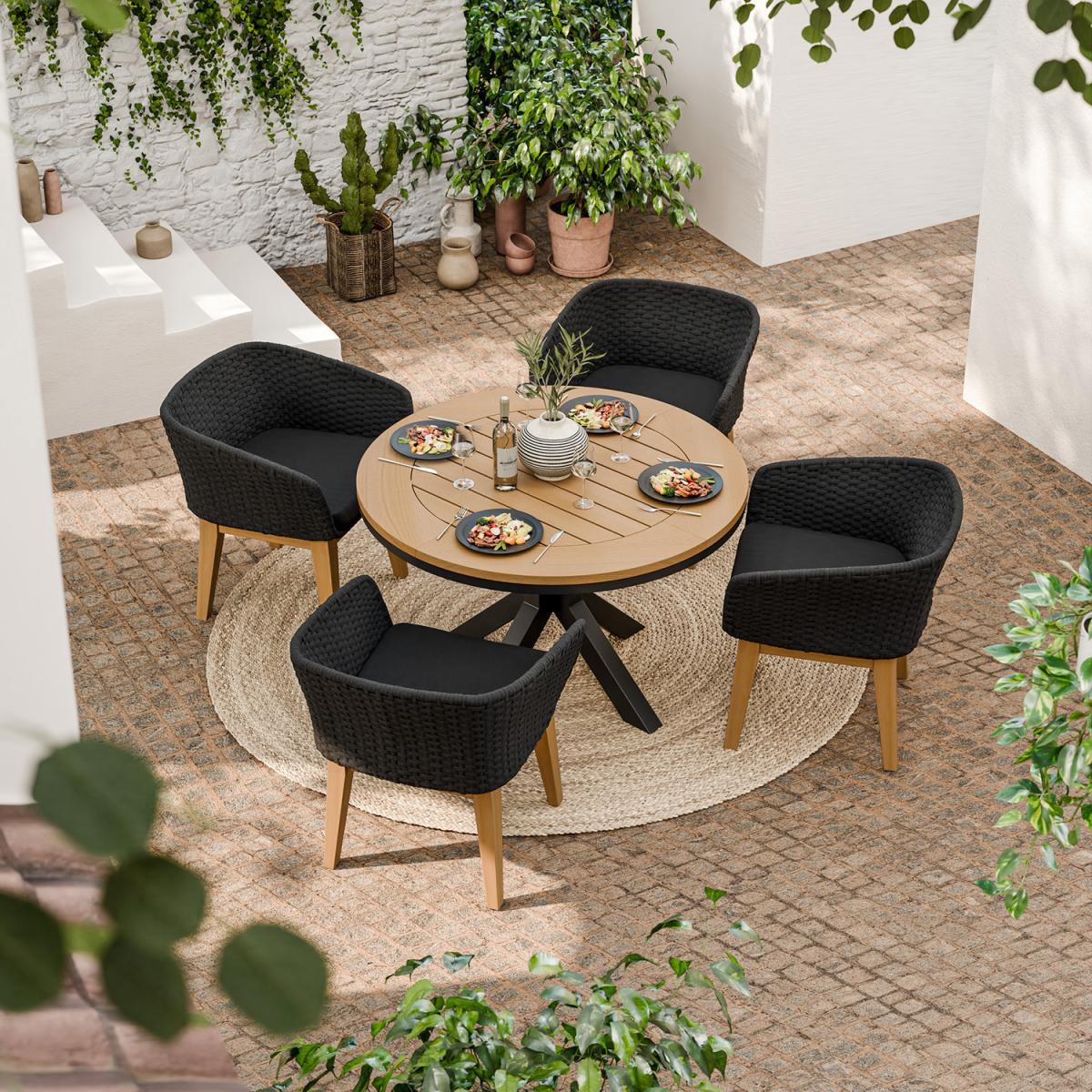 The Tuscany 4 Seater Dining Set from Royalcraft is a modern and stylish outdoor dining solution that combines durability with contemporary design. The set is ideal for those who want to enjoy outdoor dining with family and friends in style. Complete with a Tuscany 120cm round Teak wood top table and four Eden Night dining chairs including Olefin fabric seat cushions, the Tuscany 4 Seater Dining Set is an excellent choice for those looking to blend modern design with functionality for their outdoor space.