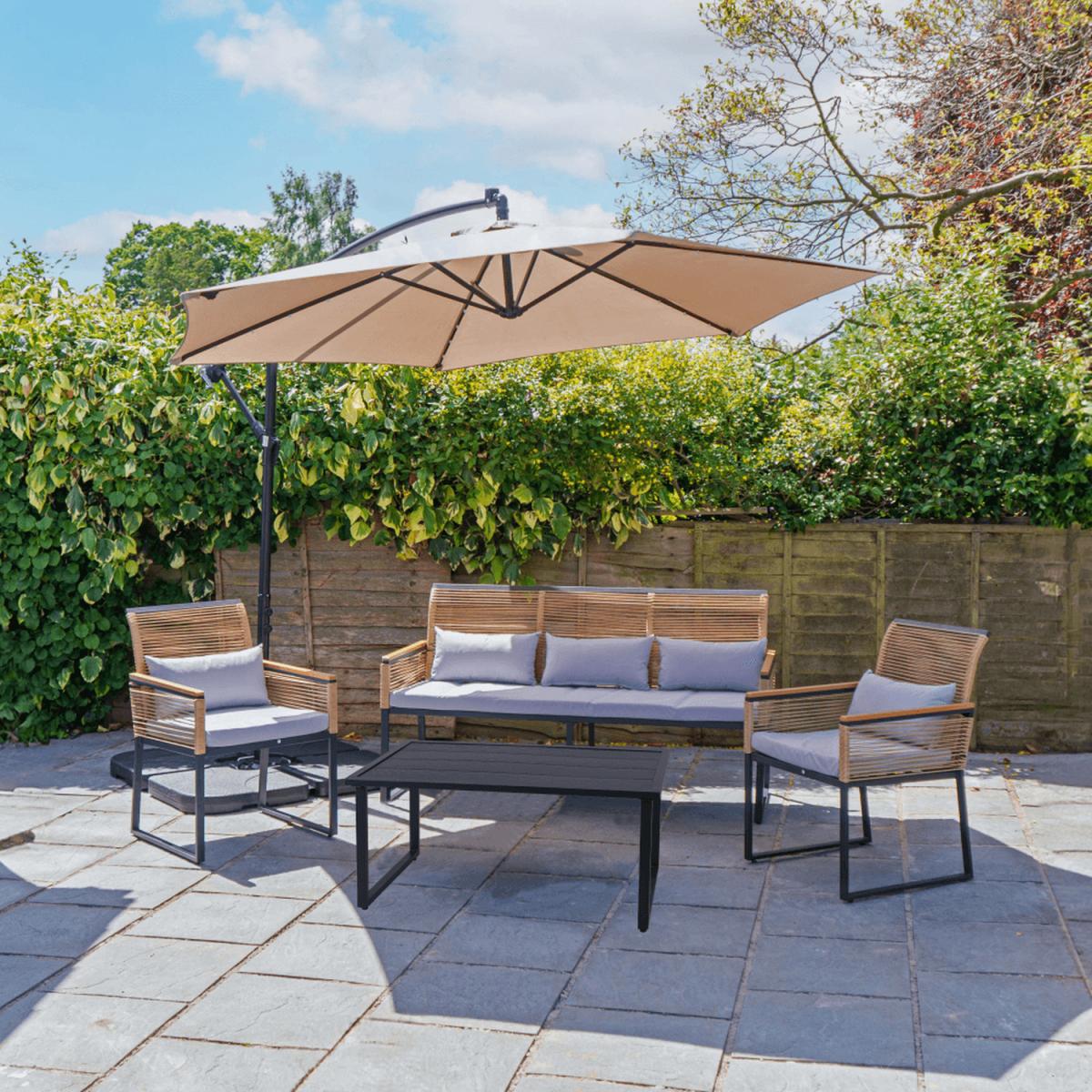 It's time to add some character to your garden with this five seater wicker sofa set. Manufactured from sturdy steel this garden sofa set is a summer must have for catching up with family and friends or relaxing in the garden. Featuring the currently trending wicker rope design across all chairs this outdoor furniture set is certain to add a modern touch to your gardens patio or decking space. Relax in ultimate comfort thanks to the wicker sets thick beige cushions and don't forget to fill the coffee table with your favourite summer snacks and drinks. Please note for longevity and to keep this sofa set looking new all year round, we recommended covering this furniture set in poor weather conditions.