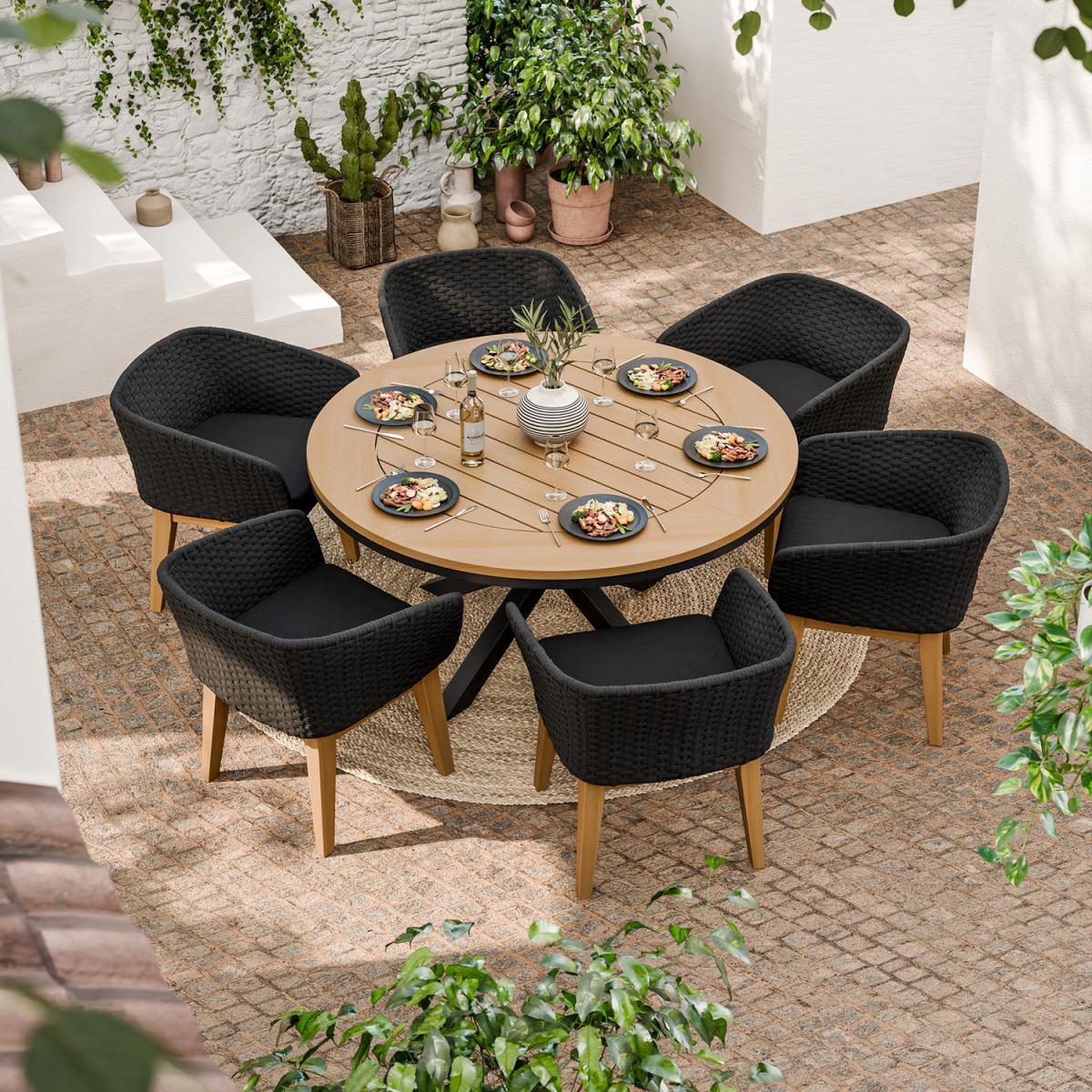 The Tuscany 6 Seater Dining Set from Royalcraft is a modern and stylish outdoor dining solution that combines durability with contemporary design. The set is ideal for those who want to enjoy outdoor dining with family and friends in style. Complete with a Tuscany 150cm round Teak wood top table and six Elba Noir rope chairs including Olefin fabric seat cushions, the Tuscany 6 Seater Dining Set is an excellent choice for those looking to blend modern design with functionality for their outdoor space.