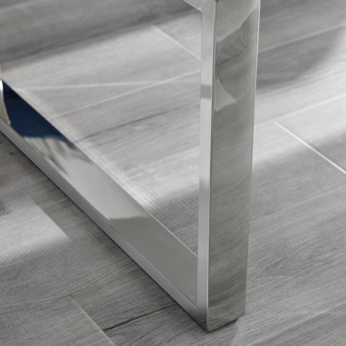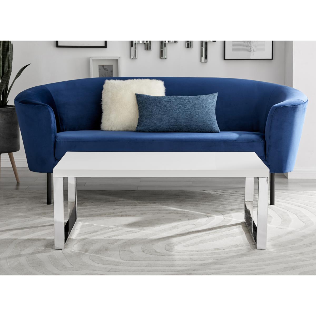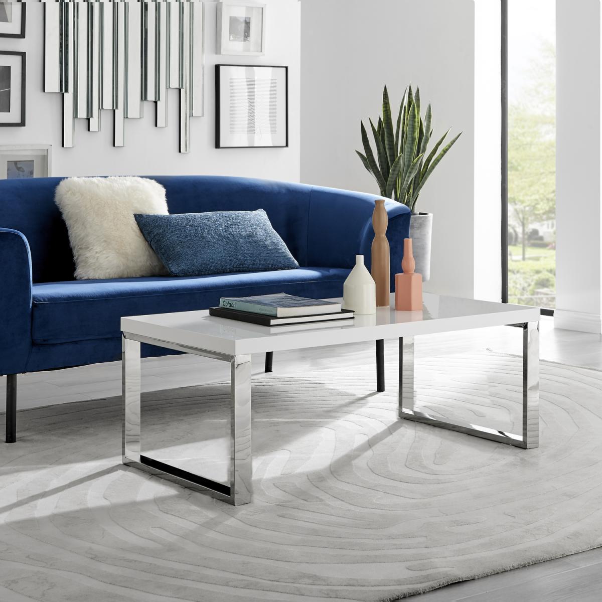 Our Tuscany rectangular white high gloss coffee table with chrome legs is very much a minimalist dream with its straight lines and clean design. Minimalist doesn't mean boring in the Furniturebox book, though! The chrome legs with square frame ends add some shine and make this a distinctive coffee table for your living room without crowding your space. The white high-gloss MDF surface is an elegant contemporary style that will suit a modern home. The structural frame style of the legs keep this airy but strong and durable. Measuring 110cm x 60cm on the surface, and 42cm tall, there's plenty of space to keep all your living room essentials in one place!