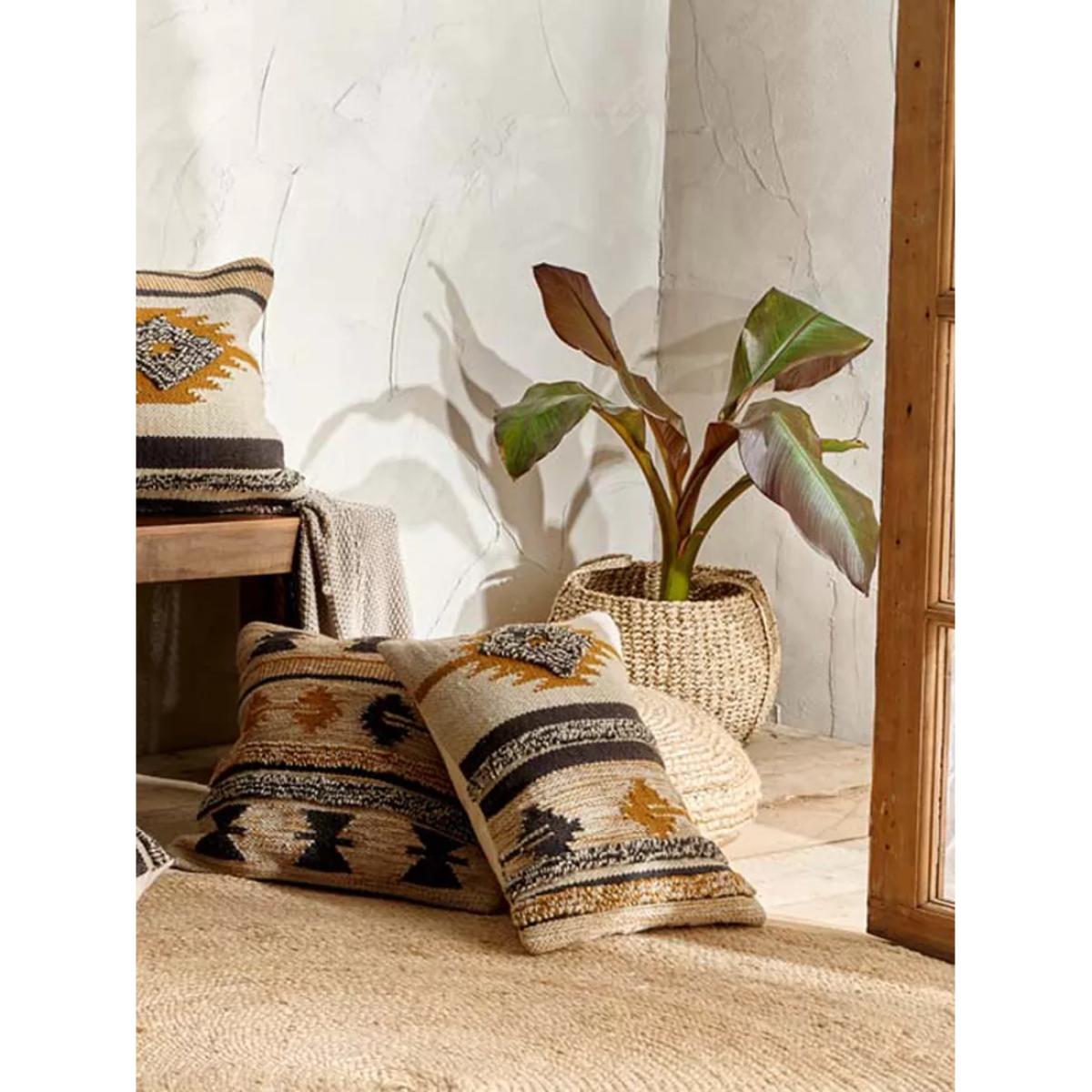 This cushion cover has a rustic, textured look and feel. Made from a blend of wool and cotton, creating a beautifully soft and durable fabric, the neutral, earthy colour palette of mustard and grey creates a stylish aesthetic. Each cushion cover is handwoven by skilled artisans in India, using age-old methods and traditional hand looms. Cushion pads available separately.