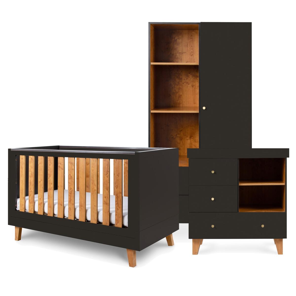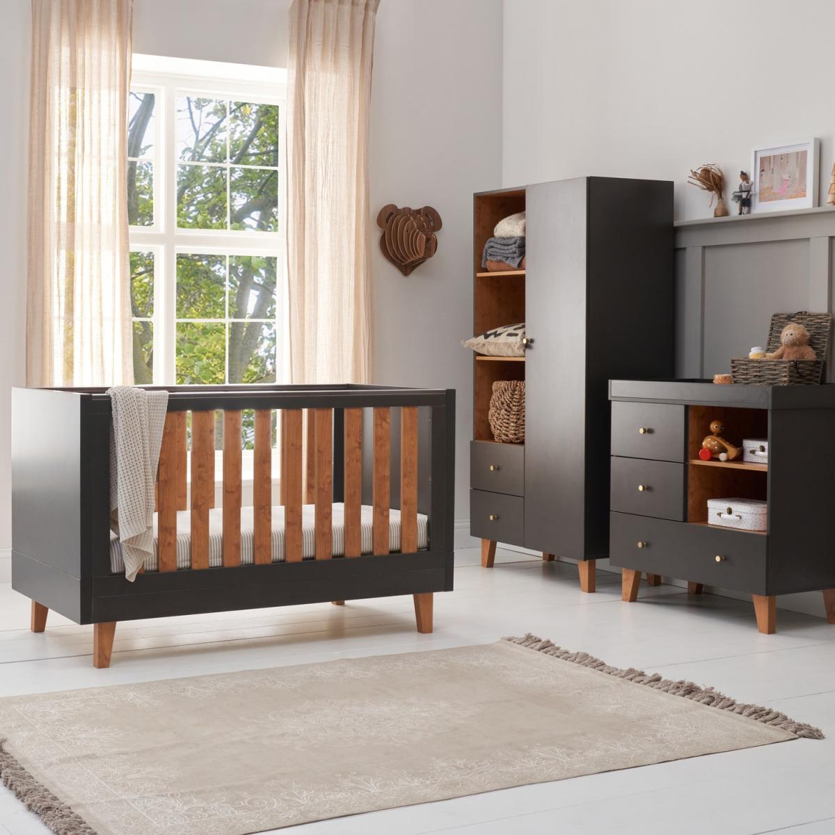 With clean lines and a contrasting combination of finishes, the Como three-piece furniture set in Slate Grey / Rosewood brings a refreshing, earthy, yet sleek aesthetic to your nursery. Cot Bed Dimensions:H91x W75x D147cm Chest Changer with 3 DrawersDimensions:H93.. 5 x W88 x D50 cm Wardrobe Dimensions:H182.5 x W85 x D50cm Features: Wardrobe: Large hanging area Wardrobe: Two hanging rails Chest Changer: Offers a mix of one full width and two half width drawers Chest Changer: The fixed draw runners have a soft-close mechanism Cot Bed: Can be converted into a toddler bed Cot bed: 3 adjustable mattress heights Cot Bed safety compliance: BS EN 713, BS EN 716, BS EN 8509 Chest Changer three drawers for storing all your baby essentials Chest Changer Large Internal Drawer Dimensions: H12 x D41.5 x W76 cm Chest Changer Small Internal Drawer Dimensions: H12 x D41.5 x W34.5 cm Wardrobe features a full width drawer and hanging rail plus a handy shelf so plenty of storage space Wardrobe Internal Drawer Dimensions:H12 x D41 x W34.5 cm Suitability: Como Cot Bed takes mattress size 140 x 70cm Como Cot Bed is suitable from birth to approximately 6 years All Tutti Bambini products are compliant with British Standards for Safety and Performance Available in the following colourways: White/Rosewood, Distressed Oak/ Slate Grey, Slate Grey/ Rosewood DELIVERY RESTRICTIONS Please note we are only able to ship Tutti Bambinito UK Mainland postcodes. We are unable to ship to Ireland, Northern Ireland, Scottish Highland or the Channel Islands.