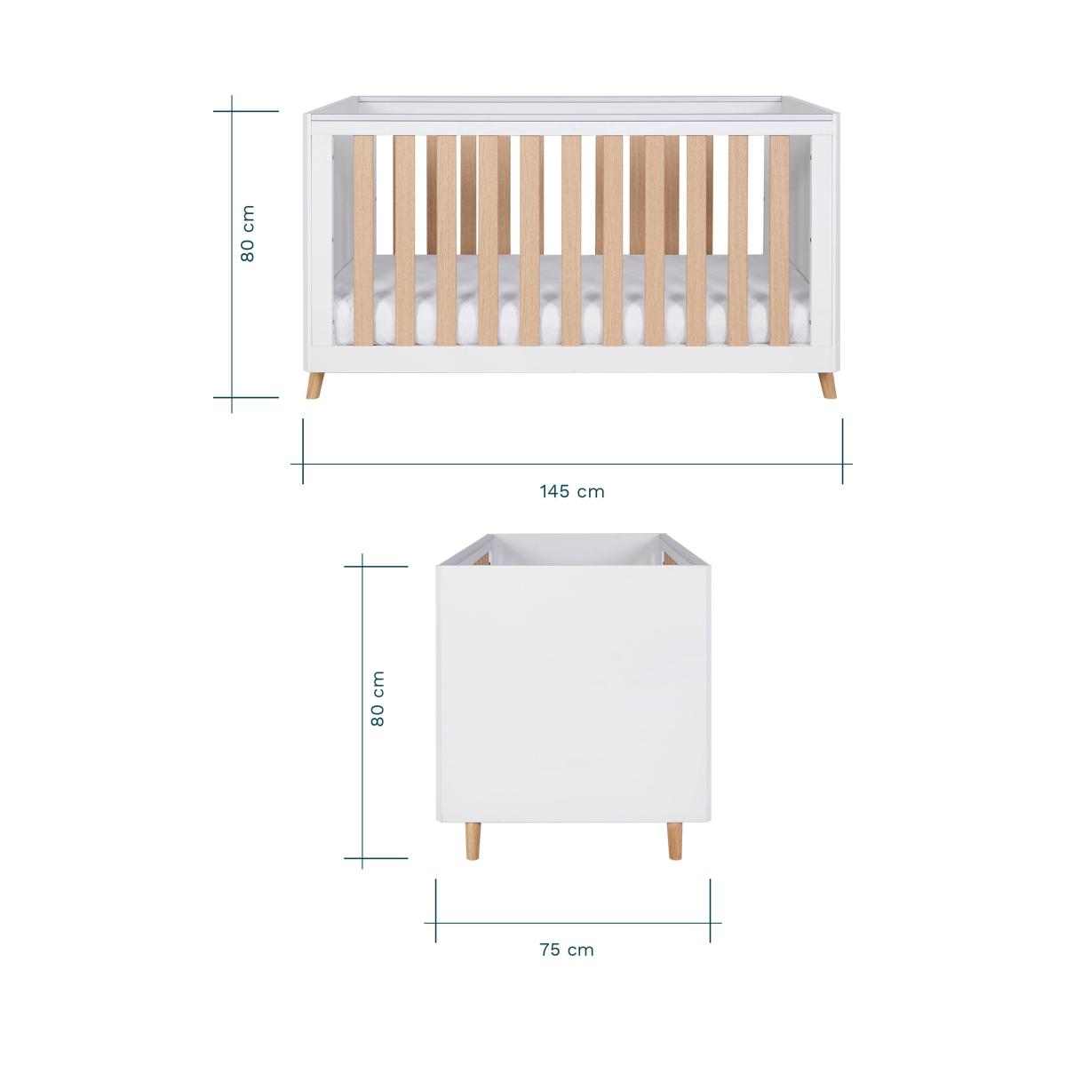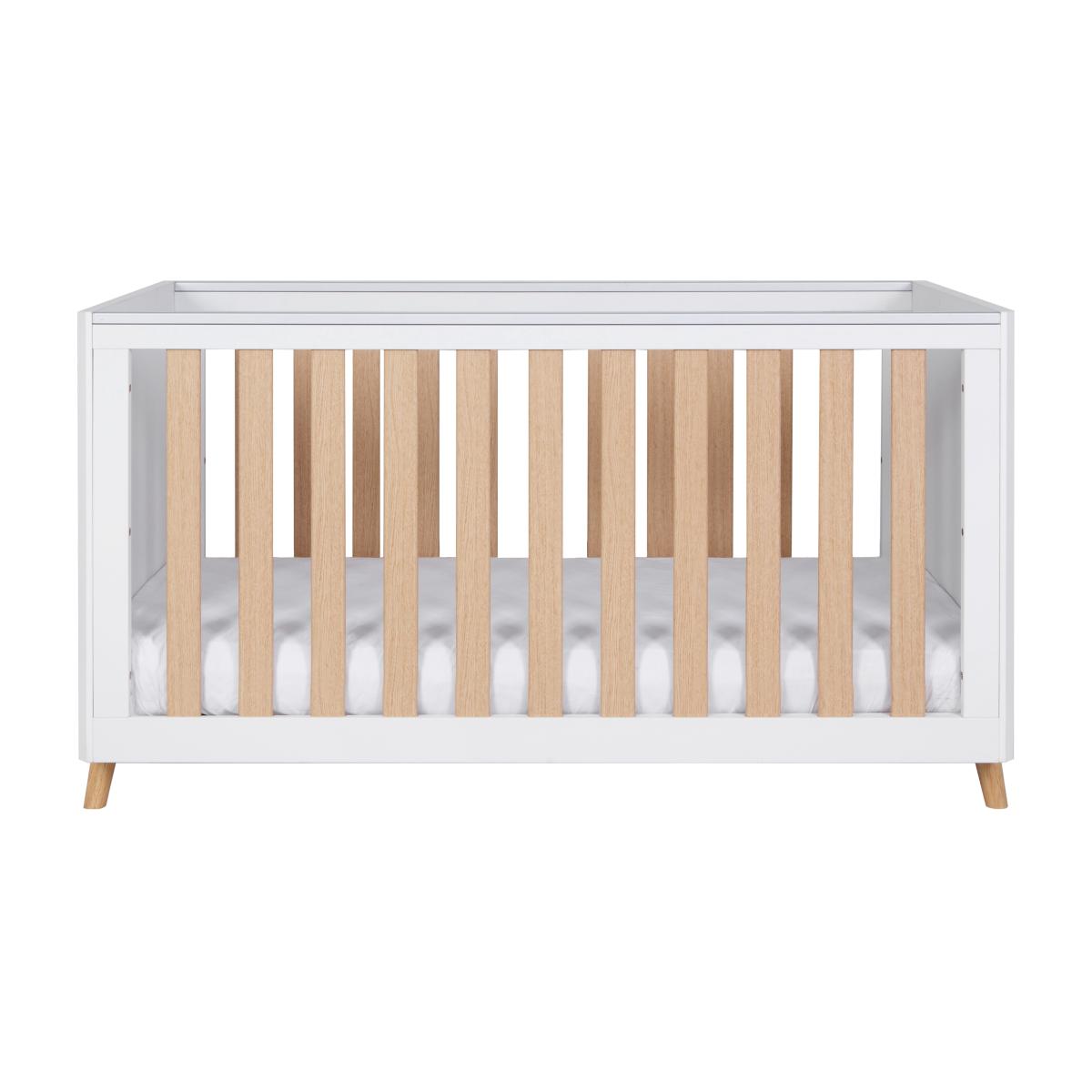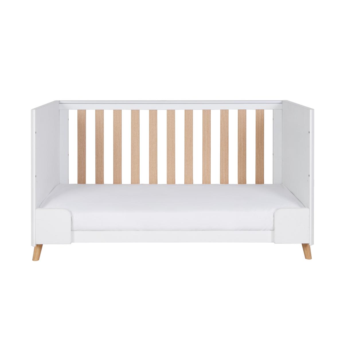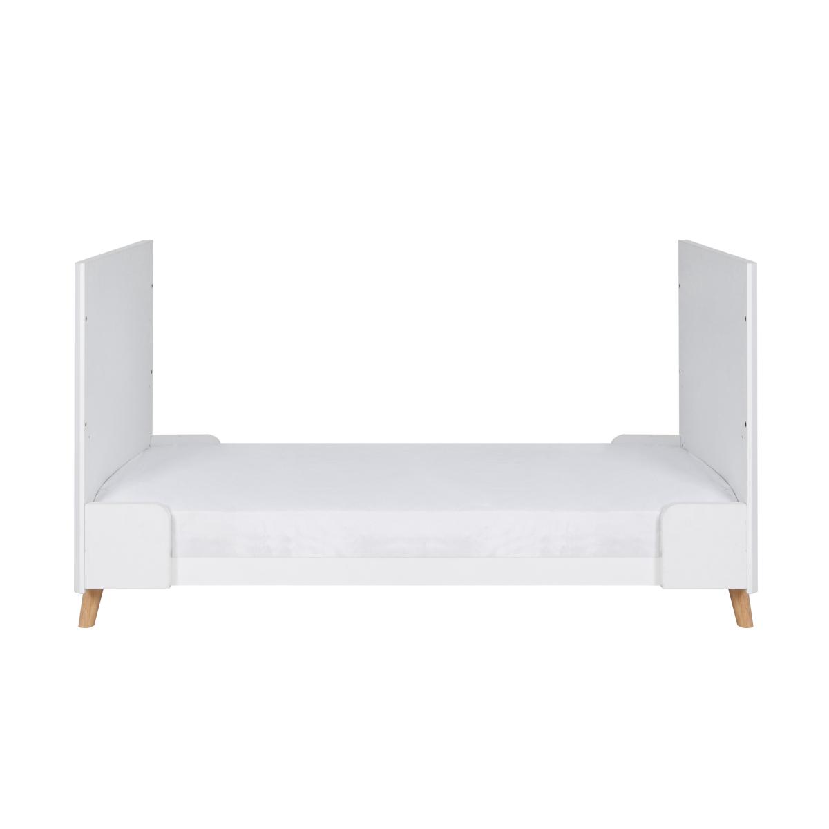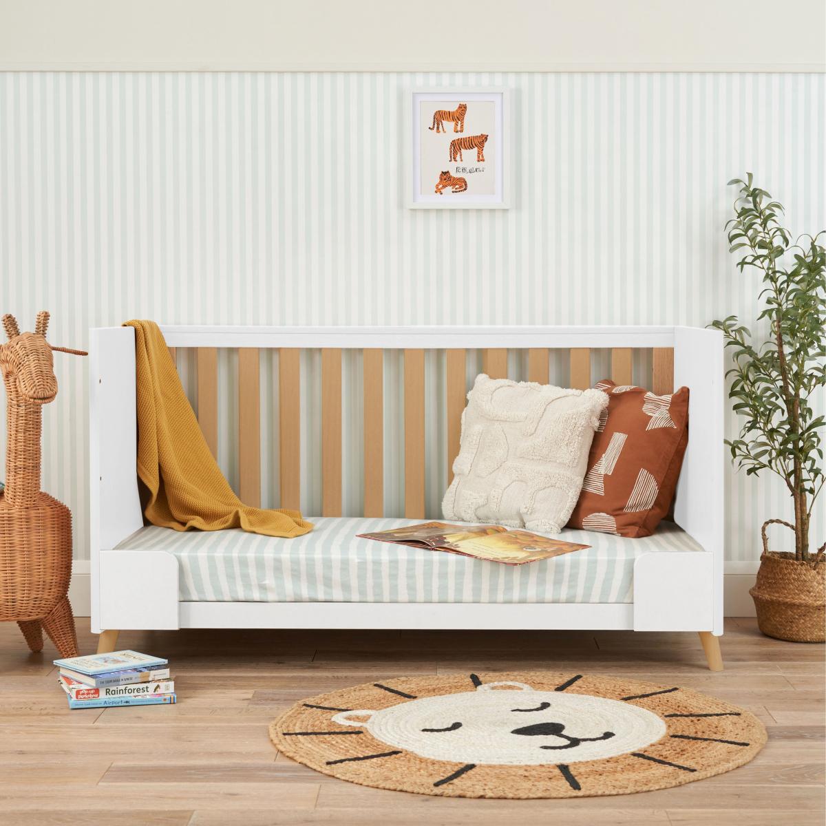 * Full size cot bed with slatted sides and solid ends* Bevelled edges provide a touch of stytle, and a quality feel* Teething rails protect your baby while teething, and prevent damage to the furniture* Cot has 3 different mattress height positions to grow with your baby* Once the Cot is outgrown (at around 2 years) it converts easily to a toddler bed for use from around 2 - 4 years* As your toddler transitions to a full size bed, the Fika Mini Cot can be converted to a sofa or day bed, for use in the nursery or playroom, allowing extended use for years to come Experience the epitome of modern elegance with the Tutti Bambini Fika Cot Bed. Crafted with clean lines and splayed legs, this Scandinavian-inspired cot bed combines minimalist design with practicality, offering adjustable mattress heights and effortless conversion into a toddler bed or sofa.