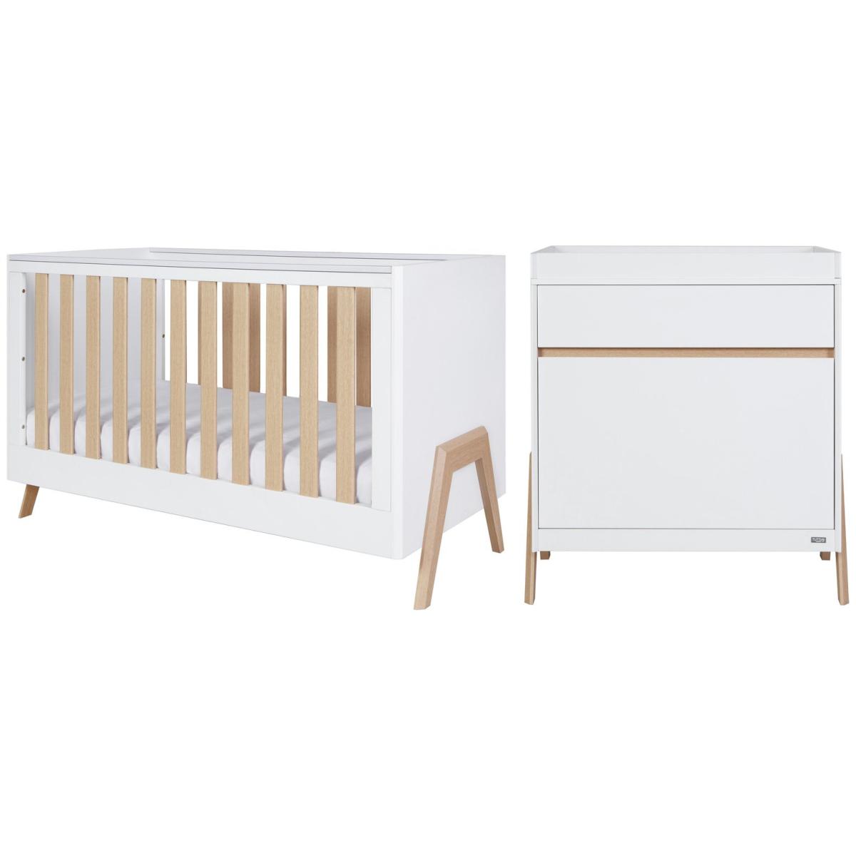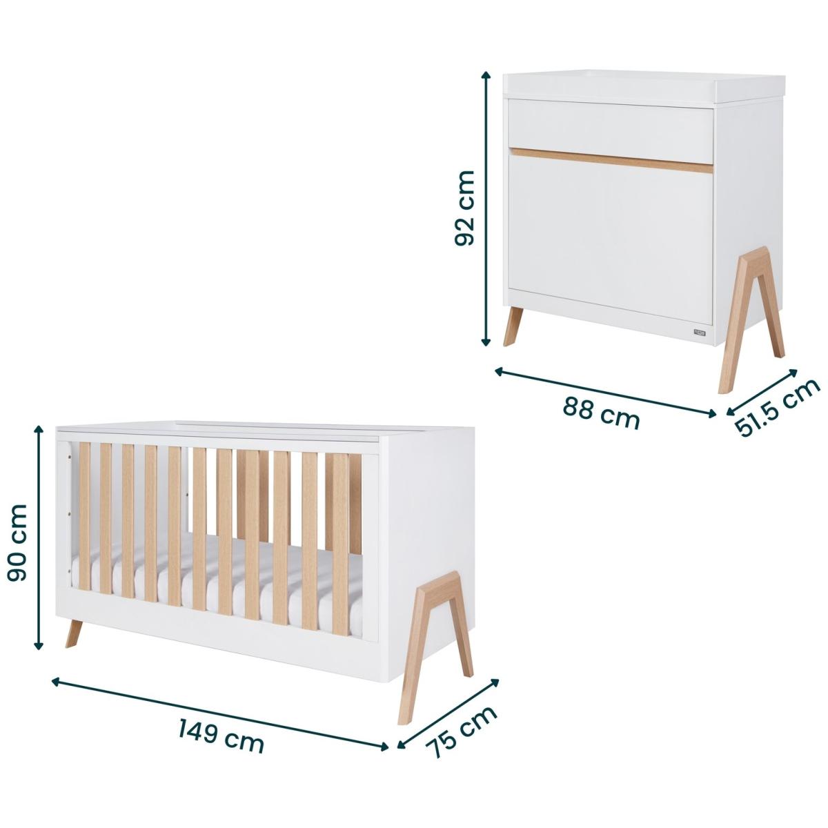 The Fuori 2 Piece Room Set in White and Light Oak brings Scandinavian-inspired simplicity to your nursery, blending modern design with practicality. This versatile set includes a Cot Bed that transitions to a toddler bed and sofa, ensuring long-term use. The matching Chest Changer features ample storage with spacious drawers and a removable changing top, adapting effortlessly as your child grows. With sleek exposed legs and a minimalist aesthetic, it's the perfect solution for modern families. The Fuori Cot Bed adapts as your child grows, transforming from a cot to a toddler bed and sofa, offering comfort and style from infancy to early childhood. The Fuori Chest Changer transitions effortlessly with a detachable changing top and roomy storage drawers, converting into a sleek dresser as your family's needs evolve. Part of the Fuori collection. 2 piece set, including: cot bed, changing unit, changer top. Cot suitable from birth until baby is able to climb out. Converts to toddler bed. Toddler bed suitable for ages 2 years to 4 years. Made of wood effect. Cot features Cot L149, W75, H90cm. Weight 47kg. 3 position adjustable mattress to lower the baby as they grow. Mattress base adjustable height 27cm, 42cm, 57cm. Mattress not included. Mattress required: L140, W70, D10cm. Teething rails. Cot bed maximum user weight 35kg. Height under cot 15cm. Chest of drawers features Drawers H92, W88, D51.5cm. Weight 41kg. 3 drawers. Changer features Weight 20kg. Changer maximum user weight 15kg. Changer top attached. Changer top detachable. Changer H92, W88, D51.5cm. Packaging Comes in 4 boxes. Largest box H150.5, W84.6, D16.2cm. Package Dimensions: Package 1 dimensions: H83.5, W84.6, D9cm. Package 1 weight: 21kg. Package 2 dimensions: H150.5, W83.5, D16.2cm. Package 2 weight: 34.7kg. Package 3 dimensions: H84, W59.5, D15.5cm. Package 3 weight: 22kg. General information Packed flat - 2 people recommended. (includes wall fixing). By choosing FSC certified products, you are supporting responsible management of the world's forests. Manufacturer's 1 year guarantee. If the product is over 60cm high it must be securely attached to the wall to prevent overturning.
