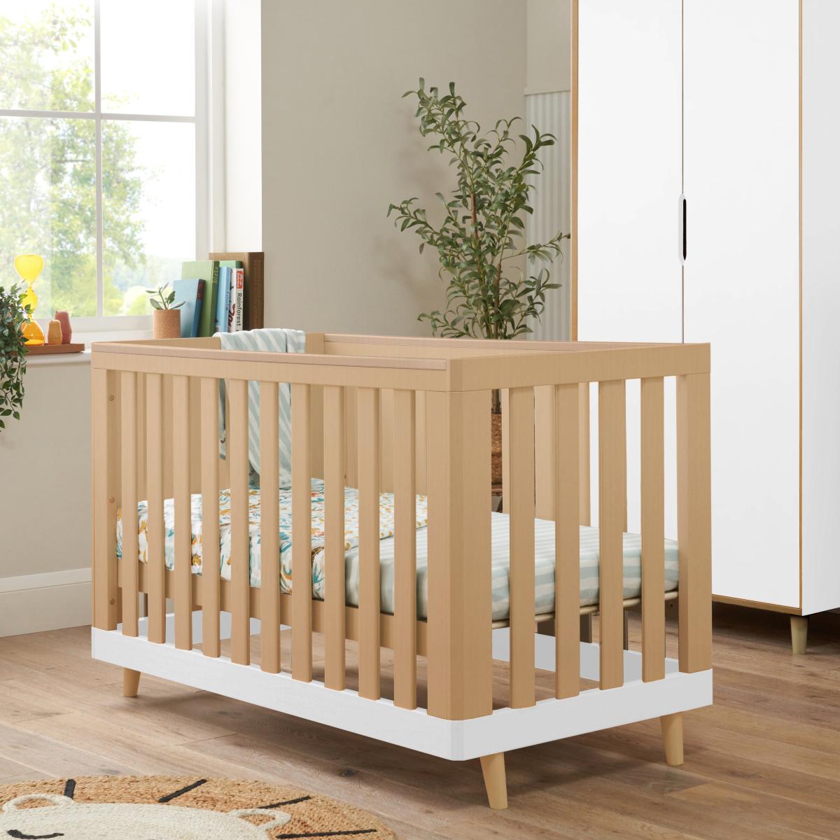 I love this little cot set for its simple, modern design that works beautifully in a range of nursery styles, from Scandi minimalism to cosy, Scandinavian-inspired interiors. Its clean white finish with natural wood accents makes it versatile and easy to pair with colourful decor or subtle pastel tones. Practical styling tips include adding layered textiles like textured blankets and cushions for added comfort, and complementing with neutral-toned furniture and storage to keep the space calm and uncluttered. The lightweight, compact design makes it ideal for small rooms or for parents who prefer an adaptable, easy-to-move setup while ensuring the nursery remains light, airy, and welcoming.