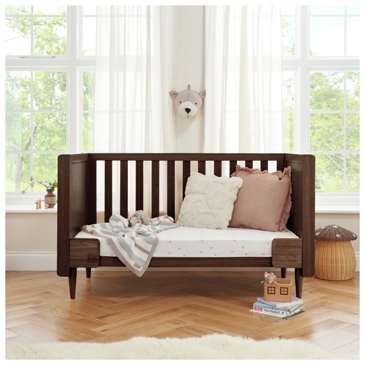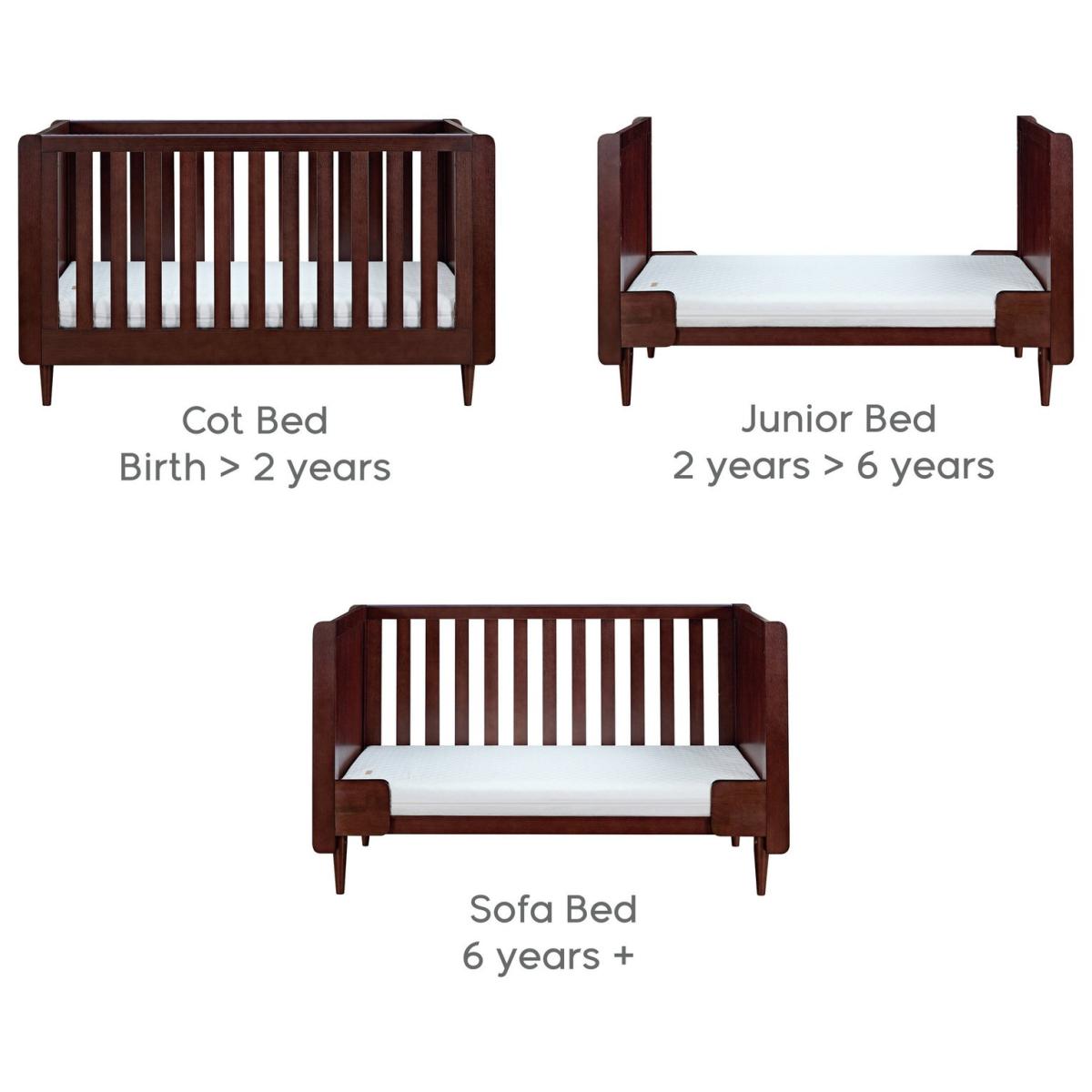 Suitable from birth, this stylish and long lasting Japandi Cot Bed features adjustable mattress base with 3 height positions to provide convenience of use at every stage of baby's development. Ensuring optimal safety, the cot features rounded corners and includes detachable teething rails, providing protection during the teething period. Deigned to adapt and evolve the Japandi Cot Bed effortlessly converts into a stylish junior bed and sofa, accommodating them up to approximately 6 years old or even longer. Part of the Japandi collection. Suitable from birth. Cot suitable from birth until baby is able to climb out. Toddler bed suitable for ages 1 years to 6 years. Suitable for babies up to 100kg. Made from pine. Cot Features Size L155, W75, H90cm. Weight 45kg. Teething rails - protects your baby's gums once they are teething and have started to chew. 3 position adjustable mattress base - allows you to lower the height of the mattress as your baby learns to sit and stand. Mattress base adjustable height 27cm, 42cm, 57cm. Height under cot 15cm. Converts to toddler bed. Mattress Features Mattress not included - use. General information Packed flat. Manufacturer's 3 year when registering online guarantee.