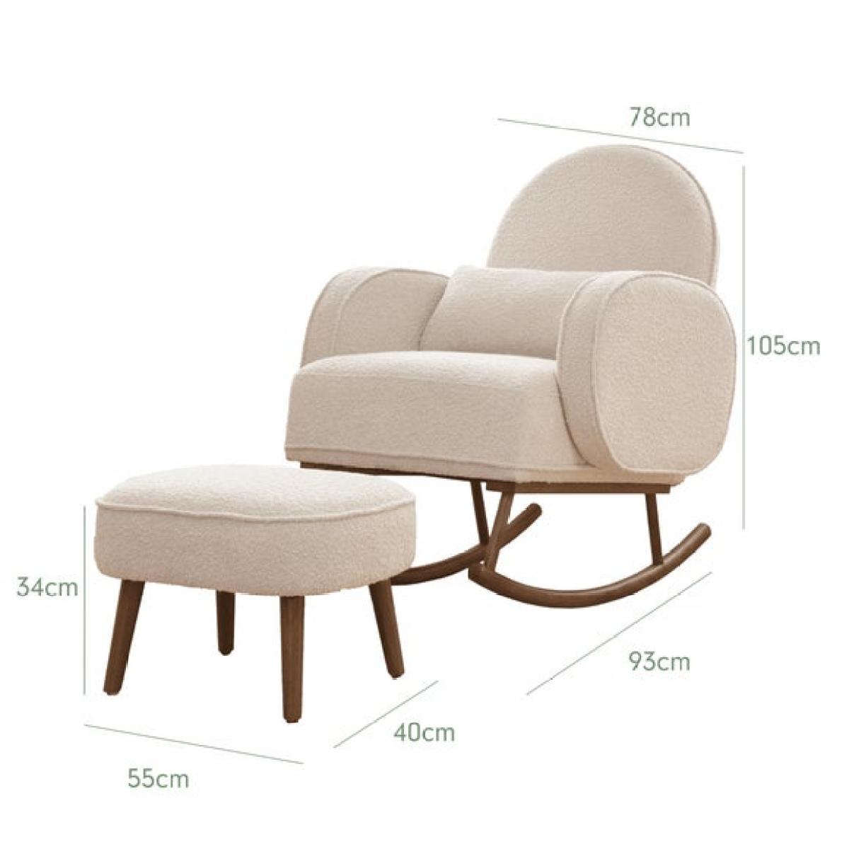 * Egonomic design providing comfort and support whilst feeding your baby, or just relaxing * Rocking Chair and Footstool included, in beautifully soft Boucle fabric with Scotchguard treatment to help avoid stains * Complements any nursery or playroom * Transform into a stylish armchair with its convertible legs, ensuring lasting functionality and chic appeal Cosy up with the Tutti Bambini Micah Rocking Chair and Footstool, crafted from soft boucle fabric for ultimate comfort. Its ergonomic design provides back and arm support, ideal for feeding or relaxing, while the included footstool complements the chair perfectly, ensuring a stylish addition to any nursery or playroom.