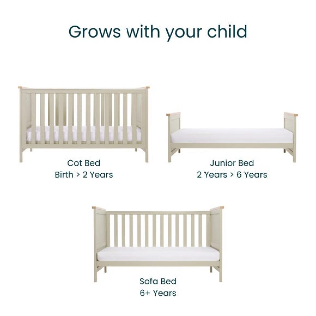 * Modern cot bed * Grows with your little one * 3 adjustable mattress heights * Suits kids up to 6 years Combining timeless elegance with practical functionality, this cot bed is designed to grow with your child. Made from engineered wood, it offers a safe and comfortable sleep space from birth up to approximately six years. With three adjustable mattress height positions, it ensures easy access and support. The design transitions seamlessly into a toddler bed and later a sofa, making it a lasting centrepiece for your nursery. Requires a 140 x 70cm mattress (sold separately).