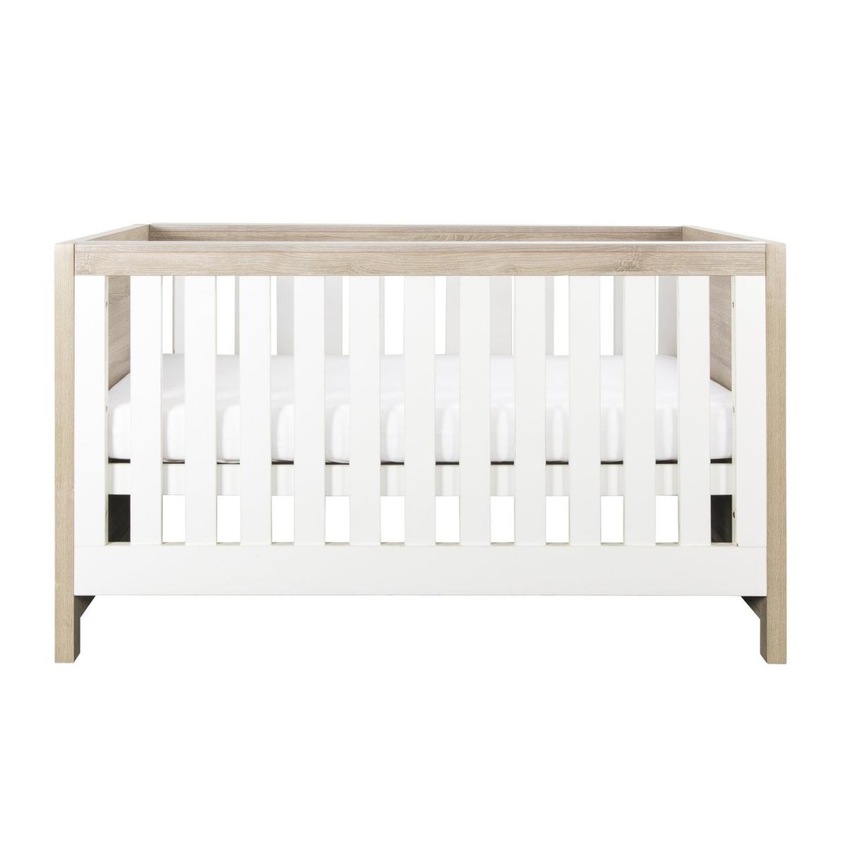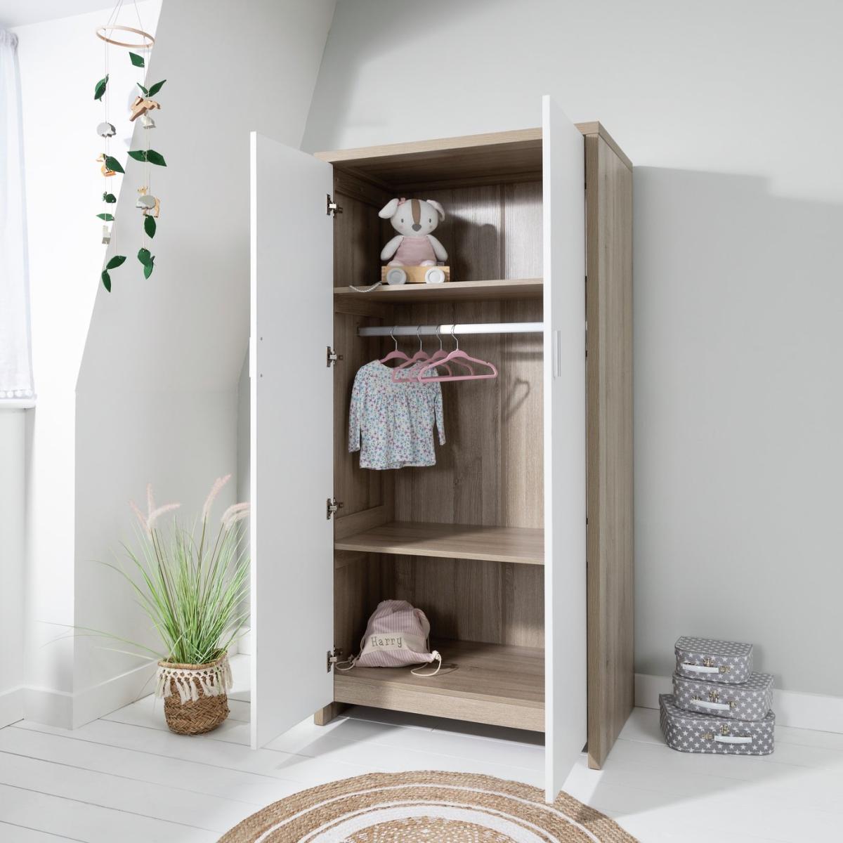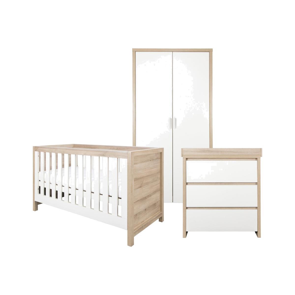 Combining a classic oak textured finish with modern white detailing, this beautiful and contemporary Modena Room Set is sure to compliment any nursery. With straight edges and clean lines, it makes the perfect choice for space saving whilst still offering plenty of storage space for all of your little one's essentials. Complete with cot bed, chest changer and wardrobe and adapts to grow with your little one. Cot Bed converts to junior bed and sofa / day bed. Plenty of storage space with 3 generous sized drawers and a two shelves and hanging rail in the wardrobe. Part of the Modena collection. 3 piece set, including: cot bed, wardrobe, changing unit, changer top. Made of MDF. Self-assembly. If the product is over 60cm high it must be securely attached to the wall to prevent overturning. - 2 people recommended. Suitable from birth years and overto 6 years. Cot features Cot L148, W75, H85cm. Weight 44kg. 3 position adjustable mattress to lower the baby as they grow. Mattress base adjustable height 24cm, 36.8cm, 52.8cm. Mattress not included. Mattress required: L70, W140,. Teething rails. Cot suitable from birth until baby is able to climb out. Converts to toddler bed. Toddler bed suitable for ages 12 months to 6 years. Cot bed maximum user weight 25kg. Height under cot 13.7cm. Wardrobe features Wardrobe H170, W85, D50cm. Weight 75kg. 2 doors. 1 hanging rail. Hanging rail weight capacity 15kg. 1 fixed shelf. 2 adjustable shelves. Chest of drawers features Drawers H92, W80, D50cm. Weight 45kg. 3 drawers. Chest of drawers internal drawer H13.2, W42.9, D67.9cm. Changer features Changer top internal H7, W46.8, D80.1cm. Weight 45kg. Changer maximum user weight 15kg. Changer top attached. Changer top detachable. Changer H92, W80, D50cm. Packaging Comes in 7 boxes. Largest box H11, W58.5, D175cm. Package Dimensions: Package 1 dimensions: H96, W84, D13cm. Package 1 weight: 24kg. Package 2 dimensions: H149.5, W82, D16cm. Package 2 weight: 30kg. Package 3 dimensions: H96, W84, D13cm. Package 3 weight: 24kg.