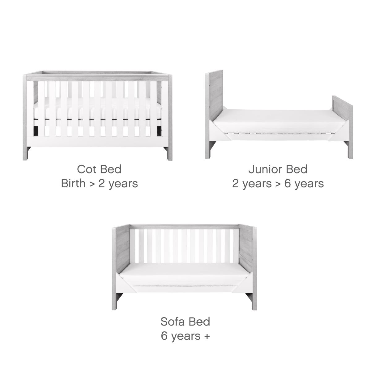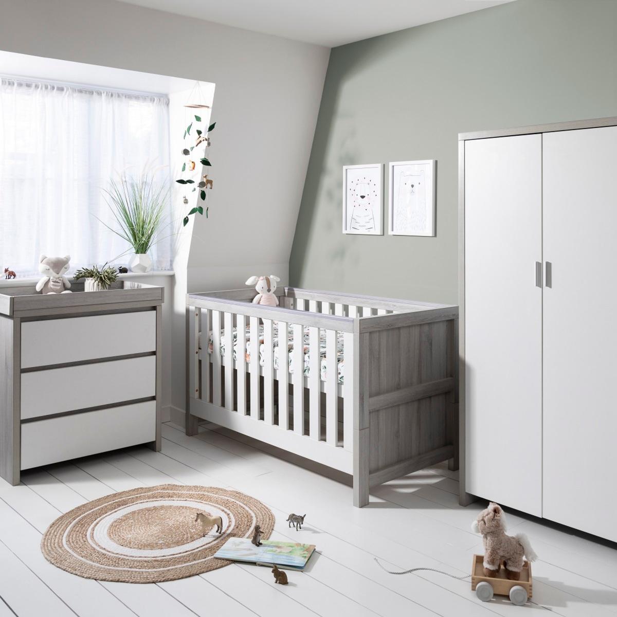 * This set contains a full sized cot bed, nursery chest of drawers with changer and wardrobe with soft closing doors.* The Modena nursery furniture is designed to last and to grow with your child* Designed to last throughout the early years, the cot bed converts into a toddler bed and a sofa. * Once your child is older, remove the changer top to leave a stylish chest of drawers that can be used for years to come. * Matching furniture and accessories available to complete the look. * Tutti Bambini 3 Year Guarantee available. Embrace durability and style with the Modena set, including a full-sized cot bed, nursery chest of drawers with changer, and wardrobe with soft-closing doors. The cot beds convert into junior beds, sofas, or day beds, offering extended utility. Remove the changer top to reveal a timeless chest of drawers as your child matures. Complete the look with matching furniture and accessories, all supported by the Tutti Bambini 3 Year Guarantee.