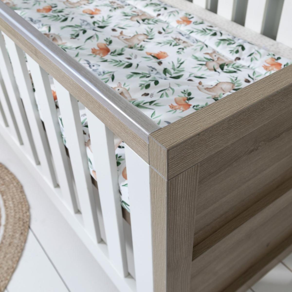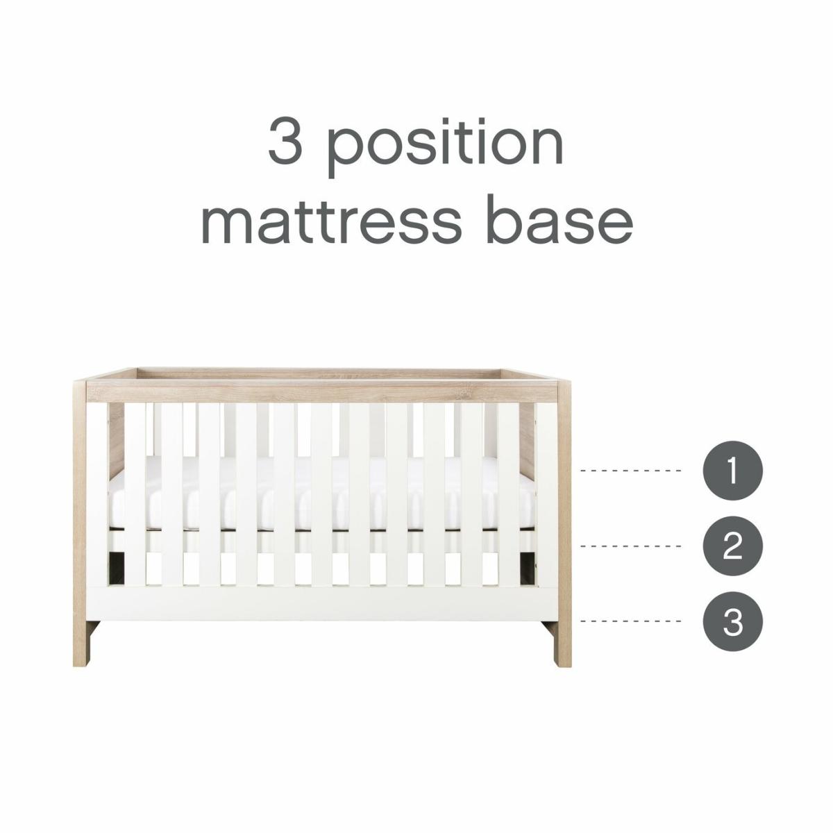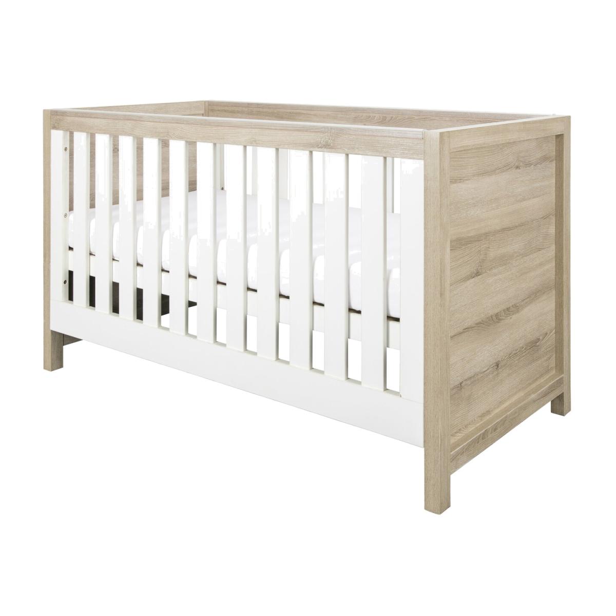 The Modena cot bed is designed in a beautiful, clean-lined contemporary style in striking white and oak. Convertible to a toddler bed and sofa, this cot bed is made to grow with your little one. Suitable from birth up to approximately 6 years Converts into a toddler bed and sofa bed Three Position Bed Base Two protective teething rails. Part of the Modena collection. Suitable from birthmonths to 6 years and over. Suitable for babies up to 50kg. Made from MDF. Packed flat. Cot Features Size L148, W75, H85cm. Weight 44kg. Teething rails - protects your baby's gums once they are teething and have started to chew. 3 position adjustable mattress base - allows you to lower the height of the mattress as your baby learns to sit and stand. Mattress base adjustable height 52.8cm, 36.8cm, 24cm. Height under cot 13.7cm. Cot suitable from birth until baby is able to climb out. Converts to toddler bed. Toddler bed suitable for ages 12 months to 6 years. Mattress Features Mattress size L140, W70,. Mattress not included.