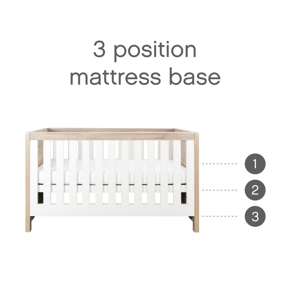 . Combining a classic oak finish with modern white detailing this beautiful and contemporary Modena Cot Bed with Changing Table is sure to compliment your nursery. Cot Bed Dimensions H85 x W148 x D75 cm Changing Table with 3 Drawers Dimensions H92 x W80 x D50 cm Features. Cot Bed is suitable from birth up to approximately 6 years converting from a cot into a toddler and sofa bed. Three position bed base. Two protective teething rails. Oak and White Finish. Made from MDFCot Bed safety compliance BS EN 713 BS EN 716 BS EN 8509. Changing Table contains 3 storage drawers. Suitability. All Tutti Bambini products are compliant with British Standards for Safety and Performance..
